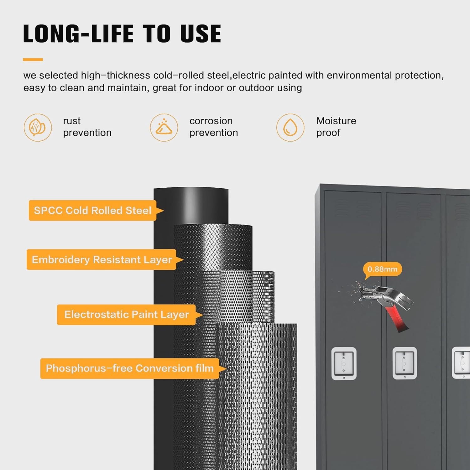 - 【Moisture-proof Leg】We have installed four standing legs at the bottom of the employee locker to prevent the bottom of the locker from touching the ground, making it easy to manage the ground and having a moisture-proof effect. And this tall storage cabinet is made of special steel, which is both anti-corrosion and easy to clean.