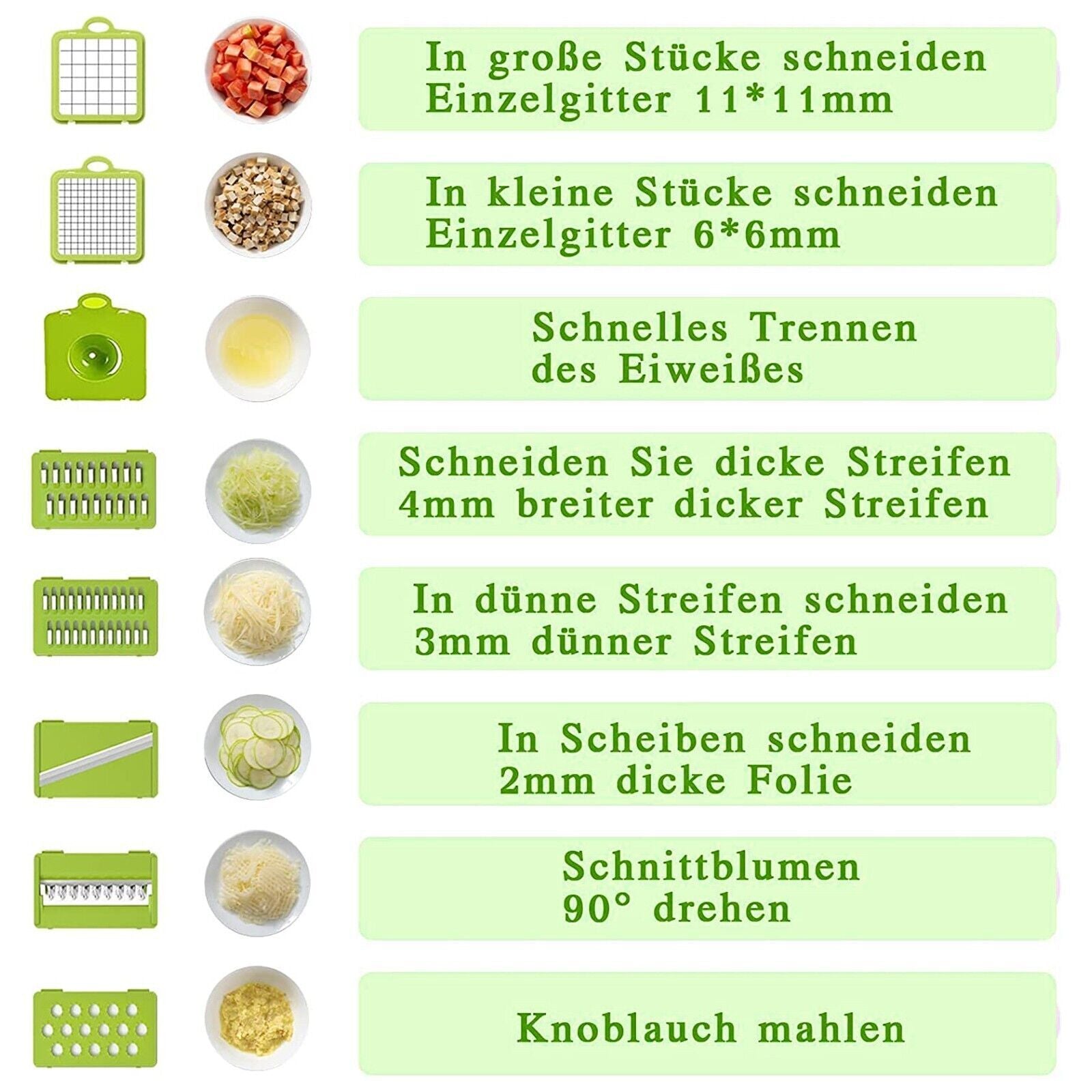 8 knives are at your disposal for dicer, slicer, grater, julienne, egg separator and egg separator. The spiral vegetable cutter with the perfect cutting function for easy and perfect cutting of foods such as tomatoes, onions, potatoes, mozzarella, hard-boiled eggs, mushrooms, carrots, cucumbers, squash, courgettes and much more.