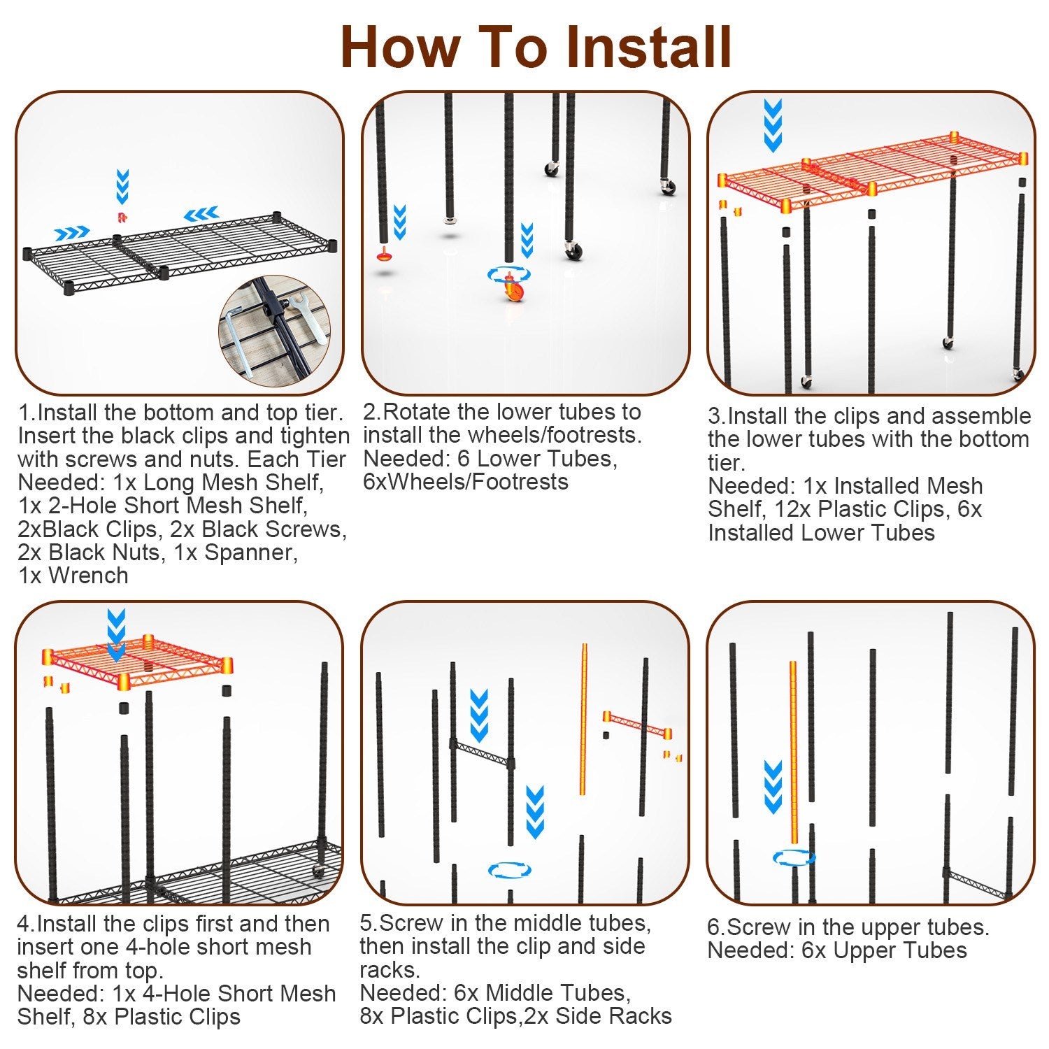 Material: Galvanized Baking Finish Carbon Steel Tubes + Steel Mesh Shelves + ABS Anti-Slip Clip