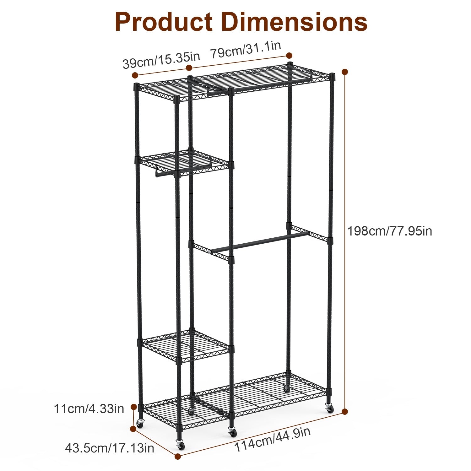 *3 Hanging Rods*:Our heavy duty garment rack with wheels comes with 3 hanging rods for more hanging space,keeping your clothes tidy and easy to reach.