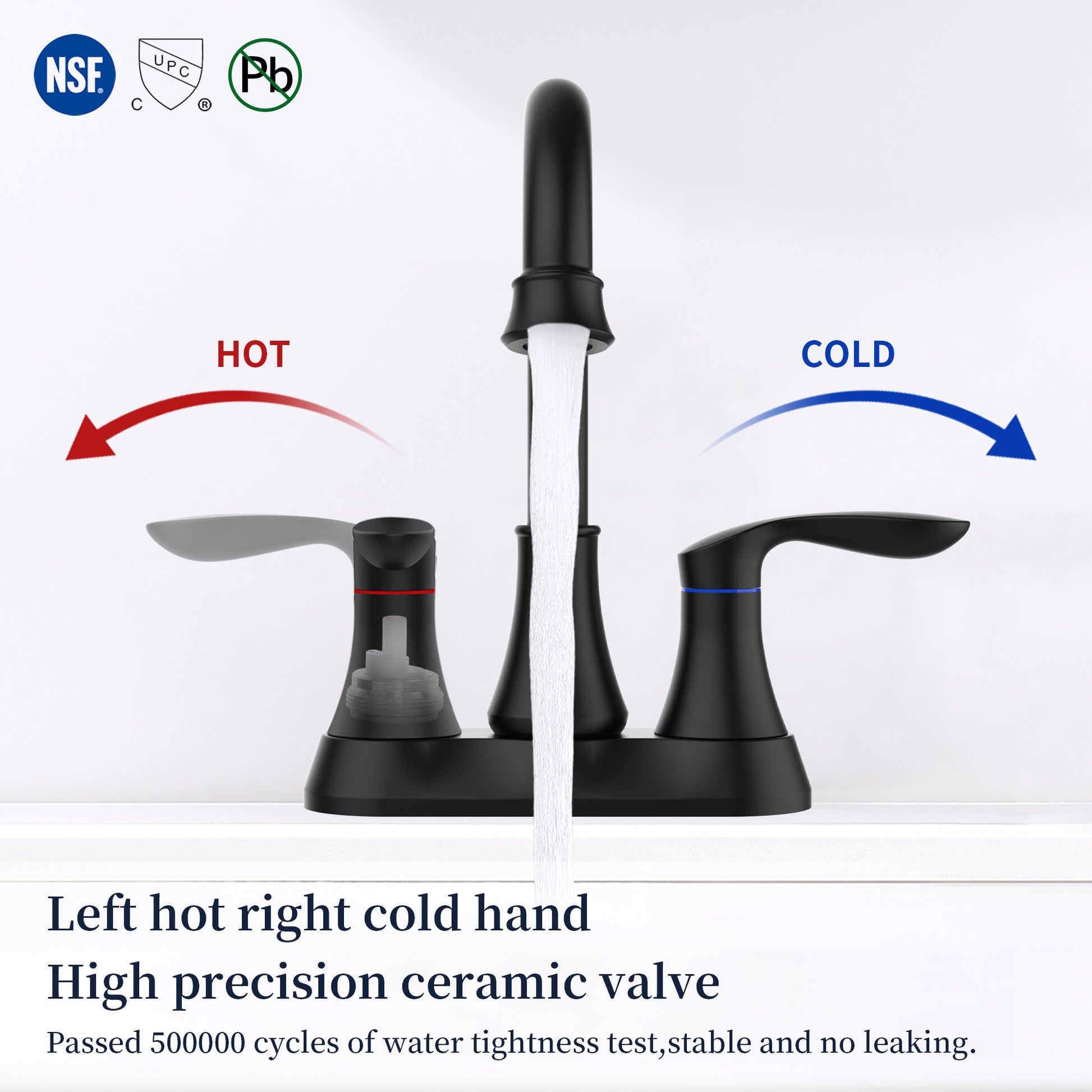 【 TWO-HANDLE METAL LEVER 】- 2 handle lever bathroom faucet design for precise control in both volume and water temperature. The handle torque can reach up to 18MM, which greatly extends the handle life.(The current industry standard is 9MM). The high-quality ceramic & copper cartridge has passed 500,002 cycles of water tightness test to ensure that the brushed nickel bathroom faucet is stable.