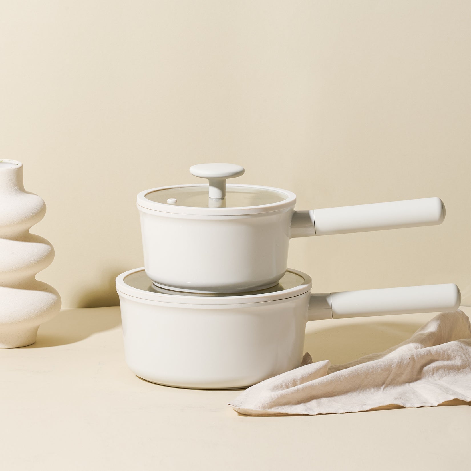 2 Piece Set 6.3 Inch,7.87 Inch ,1.5 QT,3 QT, Aluminum Mini Pots With Detachable Handles And Glass Lids ,Free Of PFOA,PFOS, Dishwasher Safe, Compatible With Gas,Electric Ceramic Cooktops