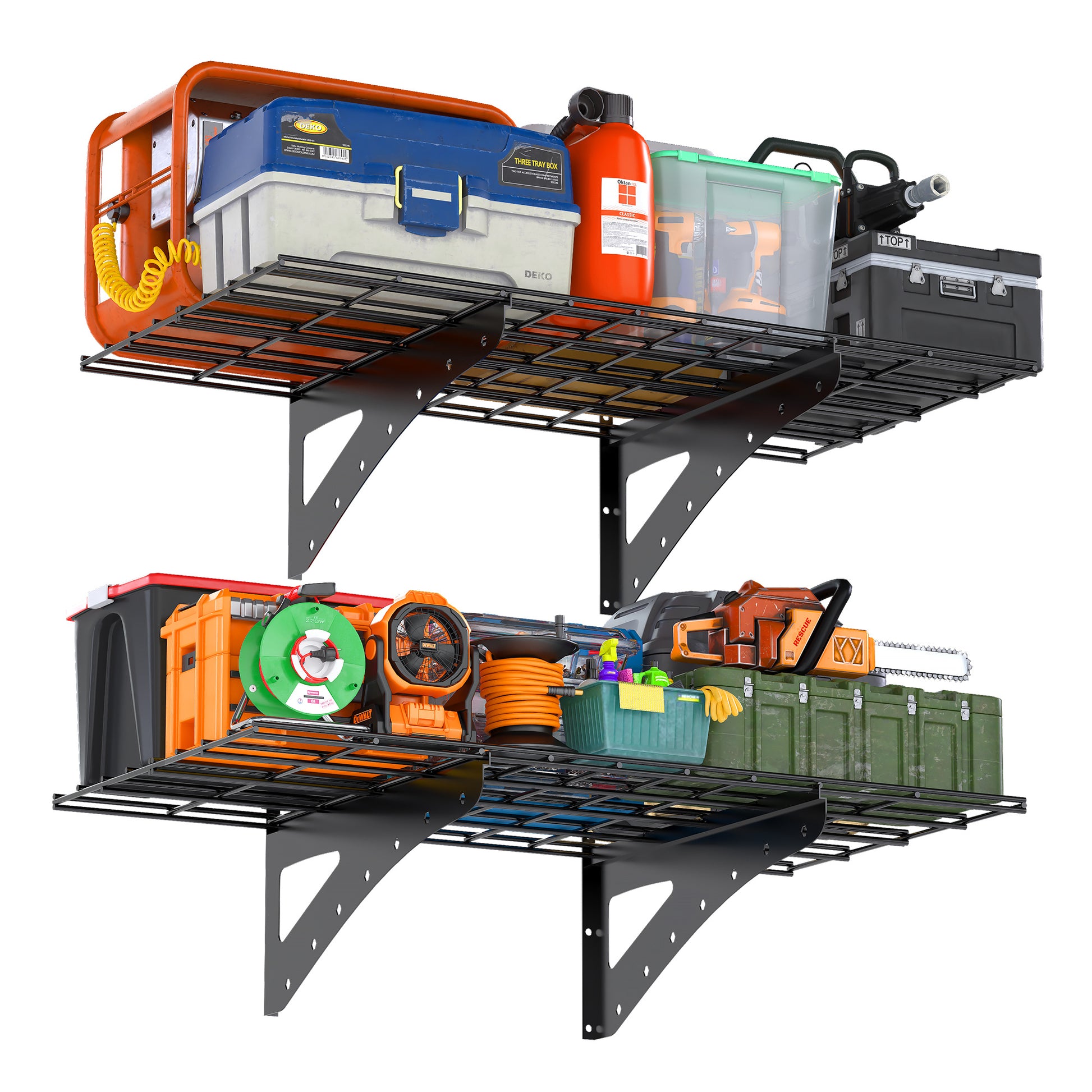 - LARGE SIZE AND HIGH LOAD: This 2*4ft hanging wall rack is made of high quality metal, each tier can provide 250lbs of extra heavy load capacity. Please note that the wall rack must be mounted on a concrete or wood wall.