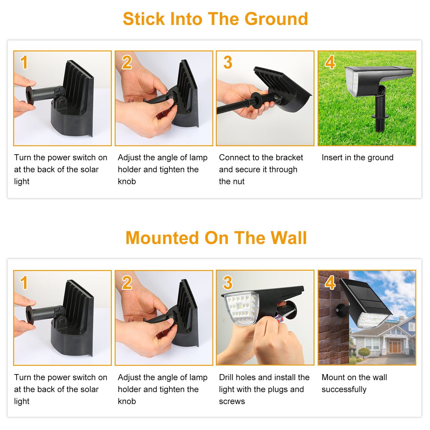 - ** 2 Installation Options *: Stick into the ground with stakes/Mount on the wall with the screws included. 90° adjustable solar panel offers perfect lighting angle. Optimum for Patio,Porch,Path,Deck,Pool,Yard,Garden,Garage,Driveway,etc.