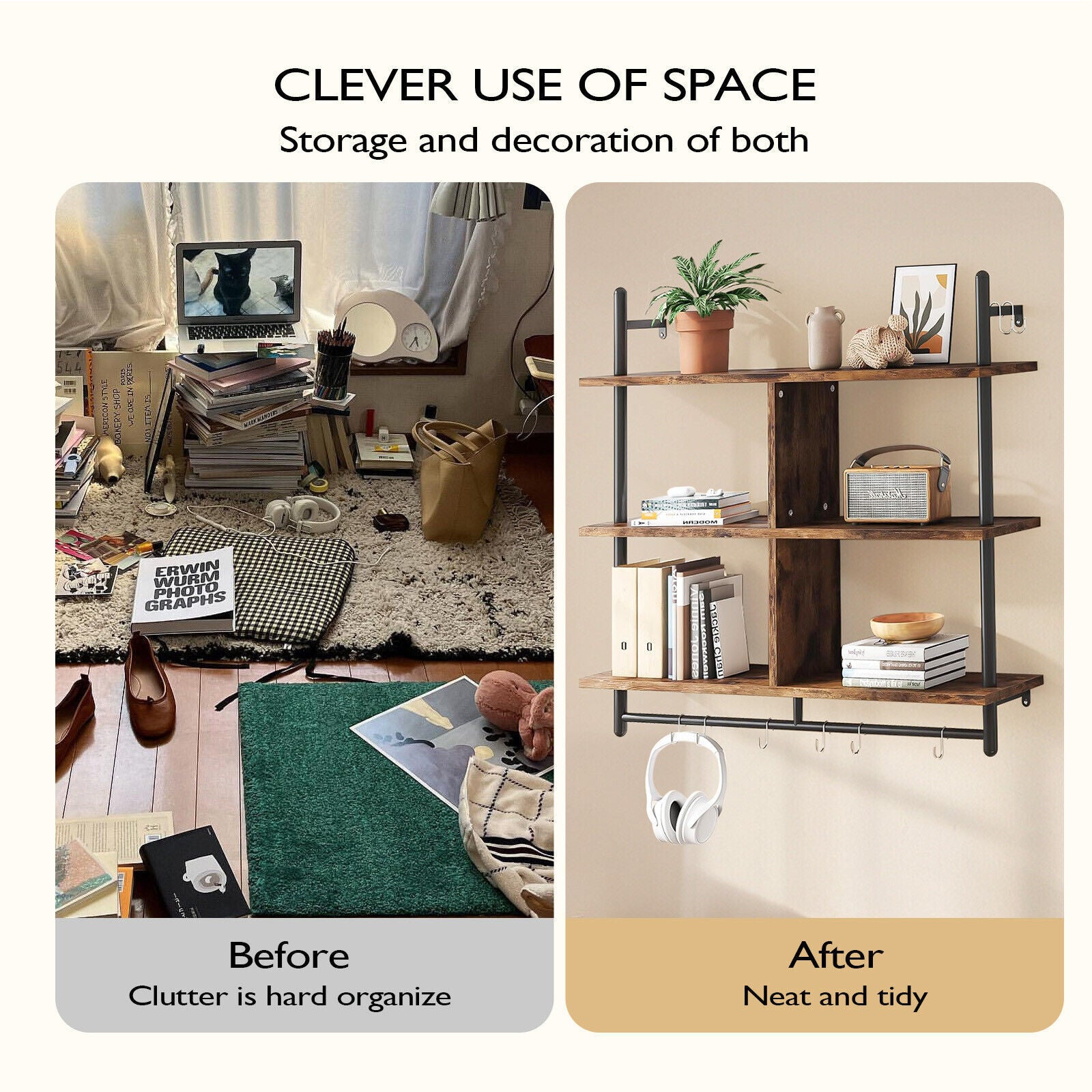 - Sturdy and Durable :This 3-shelf pipe floating shelf is constructed with durable solid wood and sturdy iron pipe that bears high weigh.Our carbon steel round pipes have a diameter of 25mm, with strong load-bearing capacity and are not easily broken, providing you with a safe and stable storage experience.