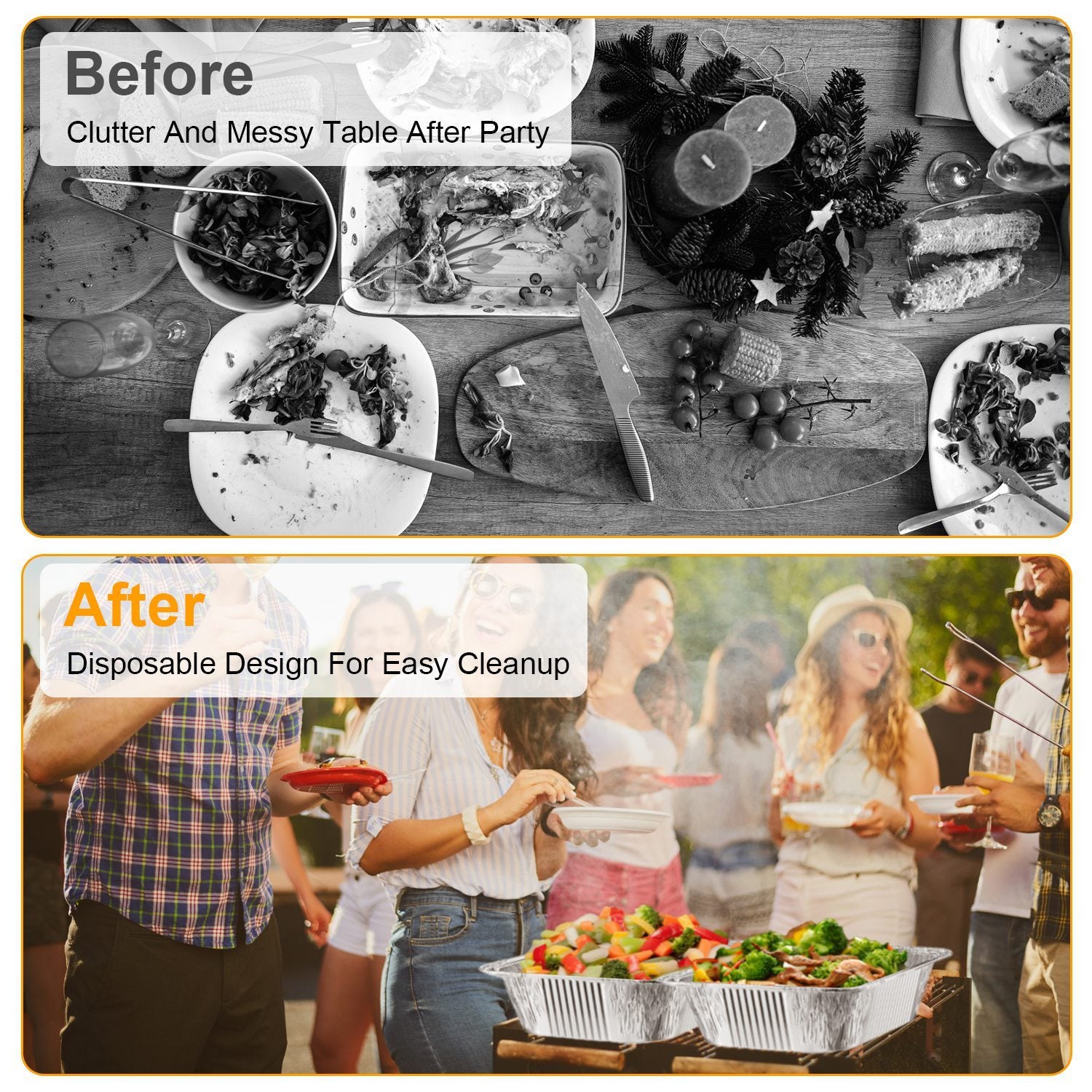 - Food-Safe Material: Made of premium aluminum foil paper, the pans and lids are food-graded, non-toxic, ensuring both of the catering quality and safety of your friends and family. Moreover, thickened plastic utensils are sturdy enough for effortlessly garbing various kinds of foods.