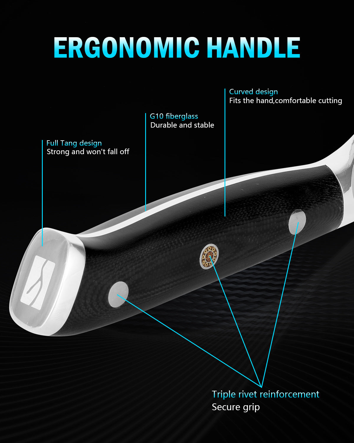 - FULL TANG ERGONOMIC HANDLE - The handle is made of G10 fiberglass, which can withstand cold, high temperature and corrosion, is crack-proof and anti-slip and is very durable. Reinforced by three rivets, the full tang design provides perfect balance and grip. The ergonomic arc design helps relieve the fatigue of holding the knife for a long time