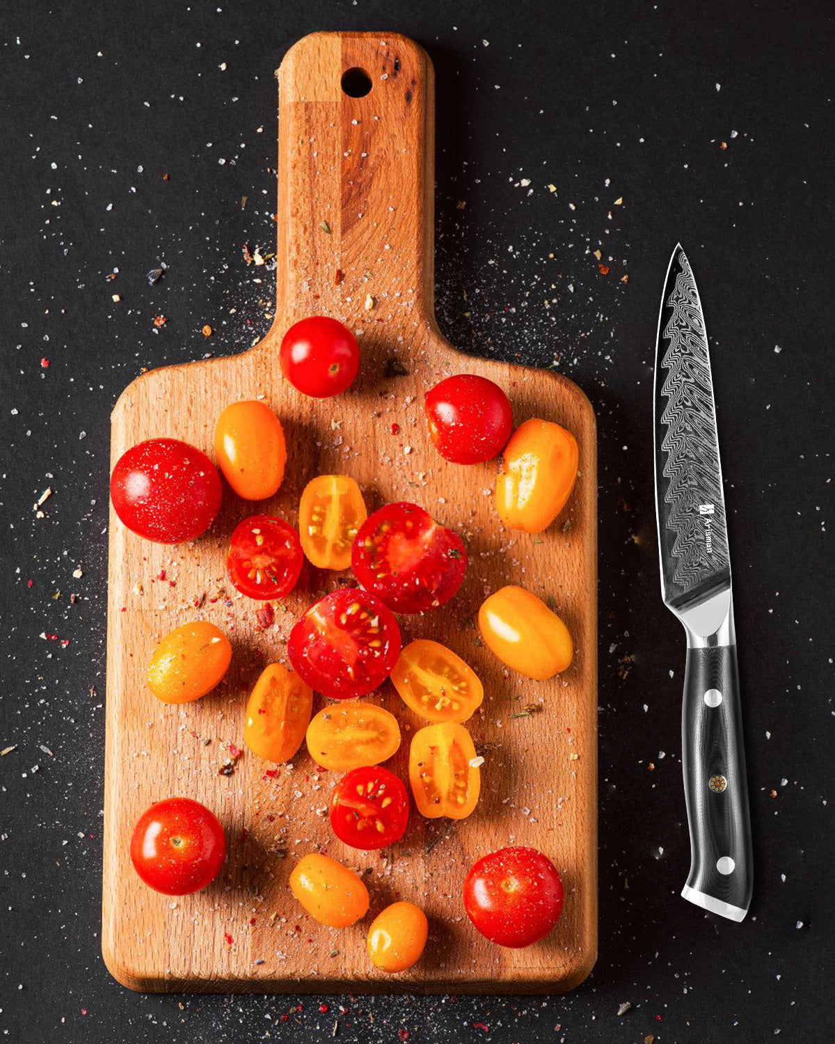 - PREMIUM SHARP - An extremely sharp small kitchen knife. The edges on both sides are hand-ground and polished at 12-15°. It cuts without resistance and can keep food in the best condition when cutting. The convenient 5 inch blade and 4-inch handle design handle any fruit or vegetable easily and smoothly, lightweight and efficient, which is perfect for professional chefs and everyday kitchens