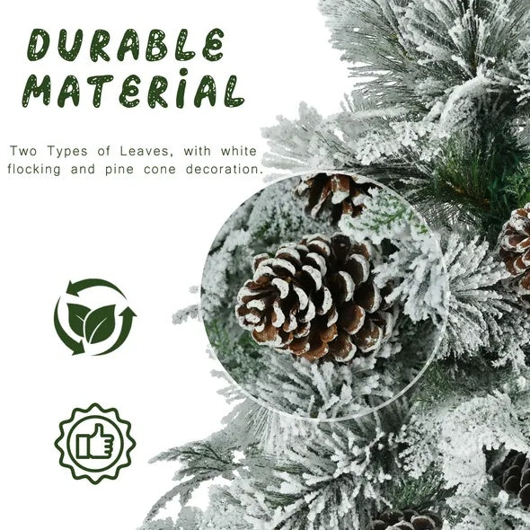 Vivid Appearance: The 6FT pre-lit artificial Christmas tree boasts 403 lush branch tips with 2 different types of snowy leaves, adorned with charming pine cones. The combination provides a vivid, natural look from any angle, creating an elegant snow-covered design. Transform your home into a magical winter wonderland with this beautifully detailed tree.