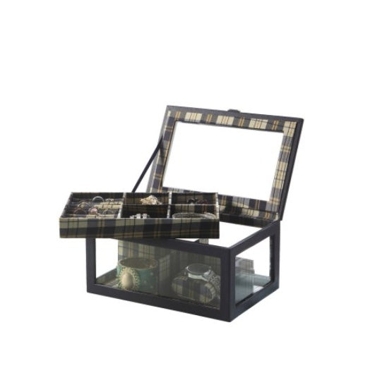 - Clear tempered glass lid and all side display. Brown textered leatherette.