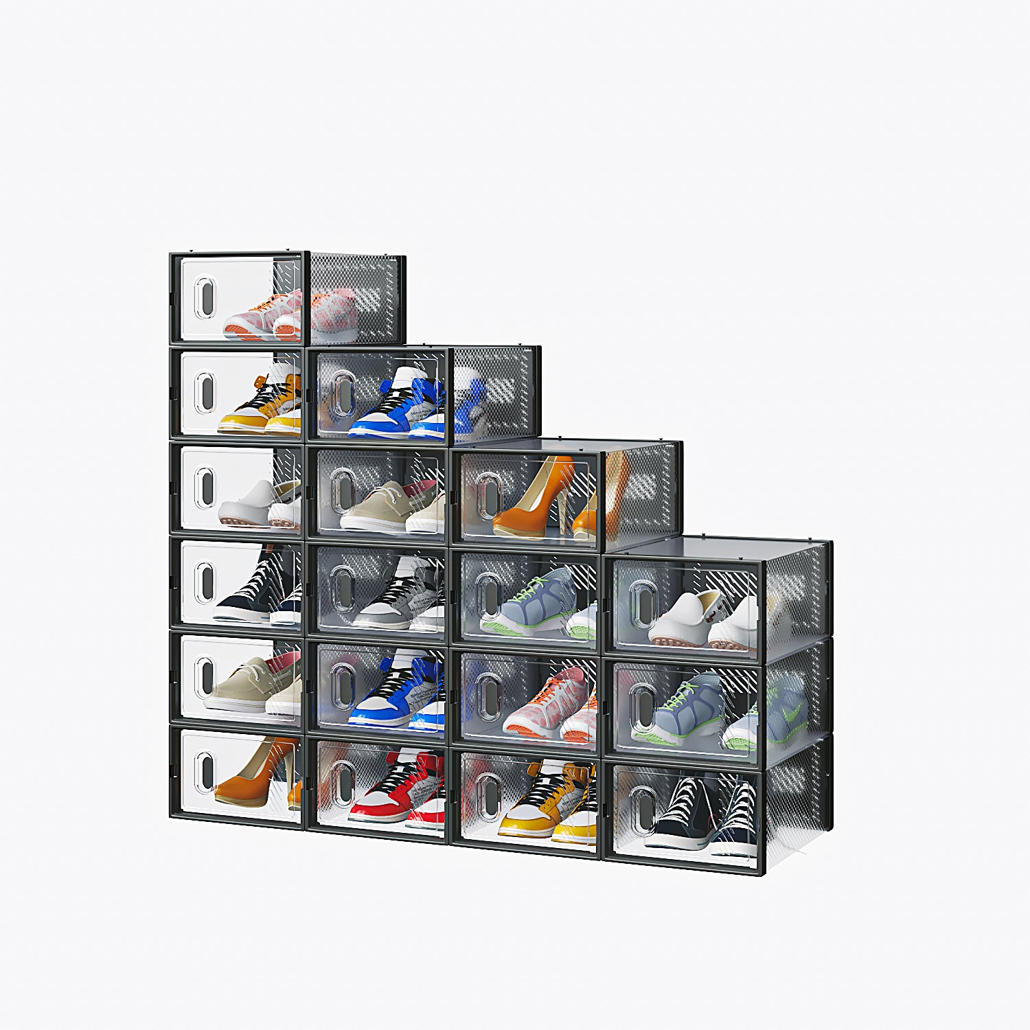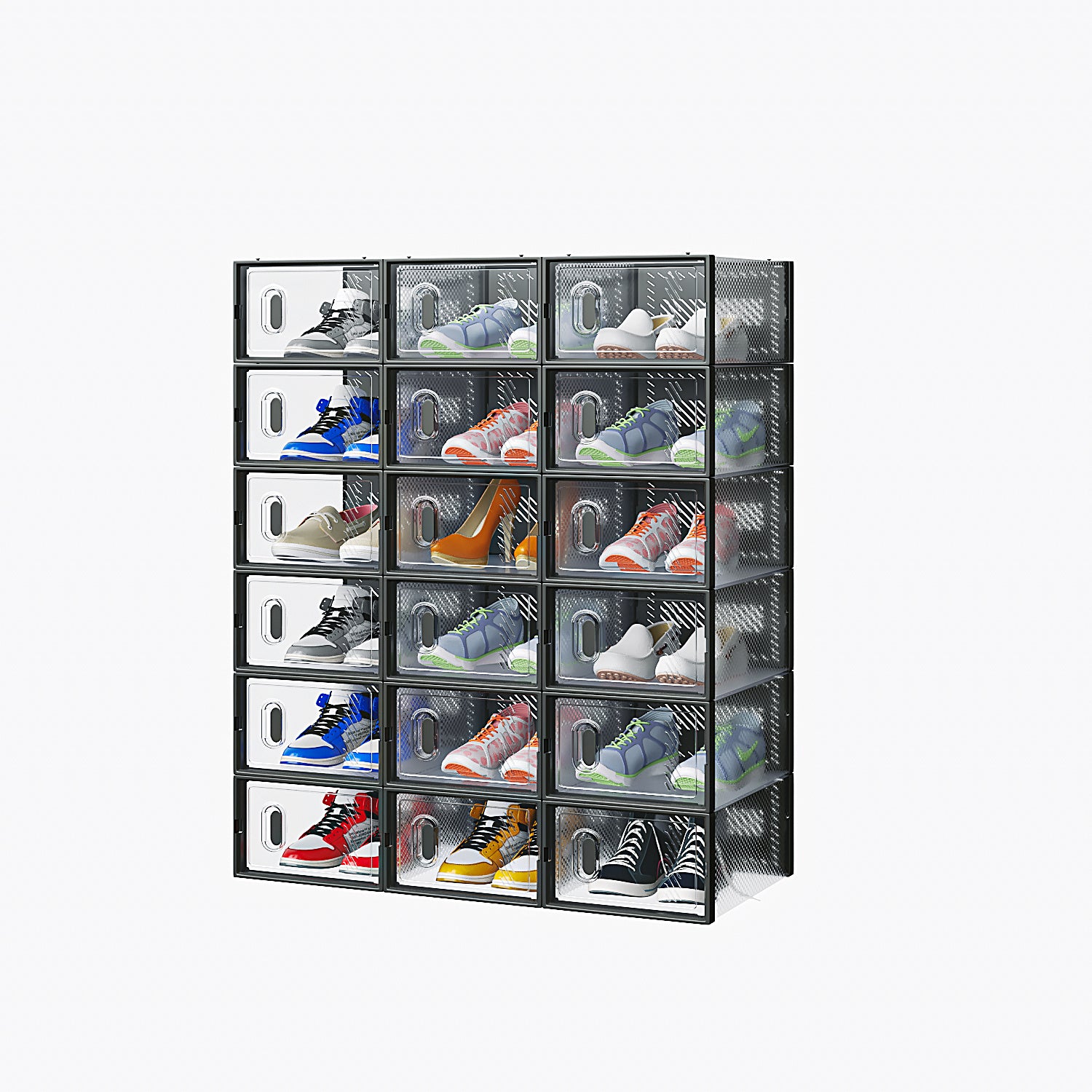 Transform your storage game with this 18-Piece Plastic Mesh Shoe Box Set , designed to bring order and efficiency to your home, dorm, or closet. Crafted in a sleek black finish, these stackable boxes are perfect for organizing shoes, accessories, and more, while saving valuable space.
