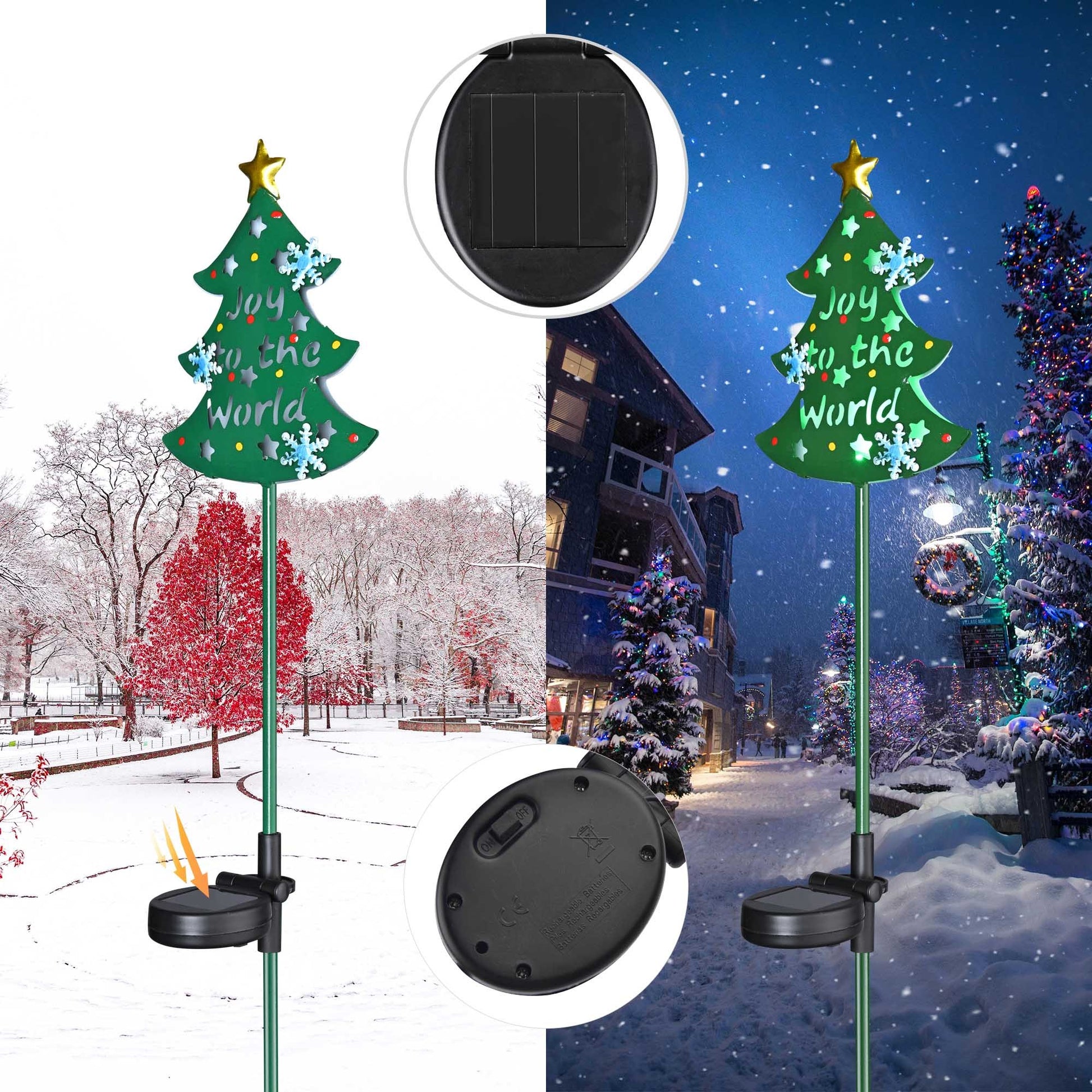 - Unique Christmas Decoration - 2 pcs 6"x4"x33" Solar Stake Lights feature Christmas tree dotted with snowflakes & gold star at the top, with interior green LED light to highlight Joy to the World, enhance festival atmosphere & fit your garden, backyard, lawn, pathway, patio, perfect for Christmas, wedding, party decoration