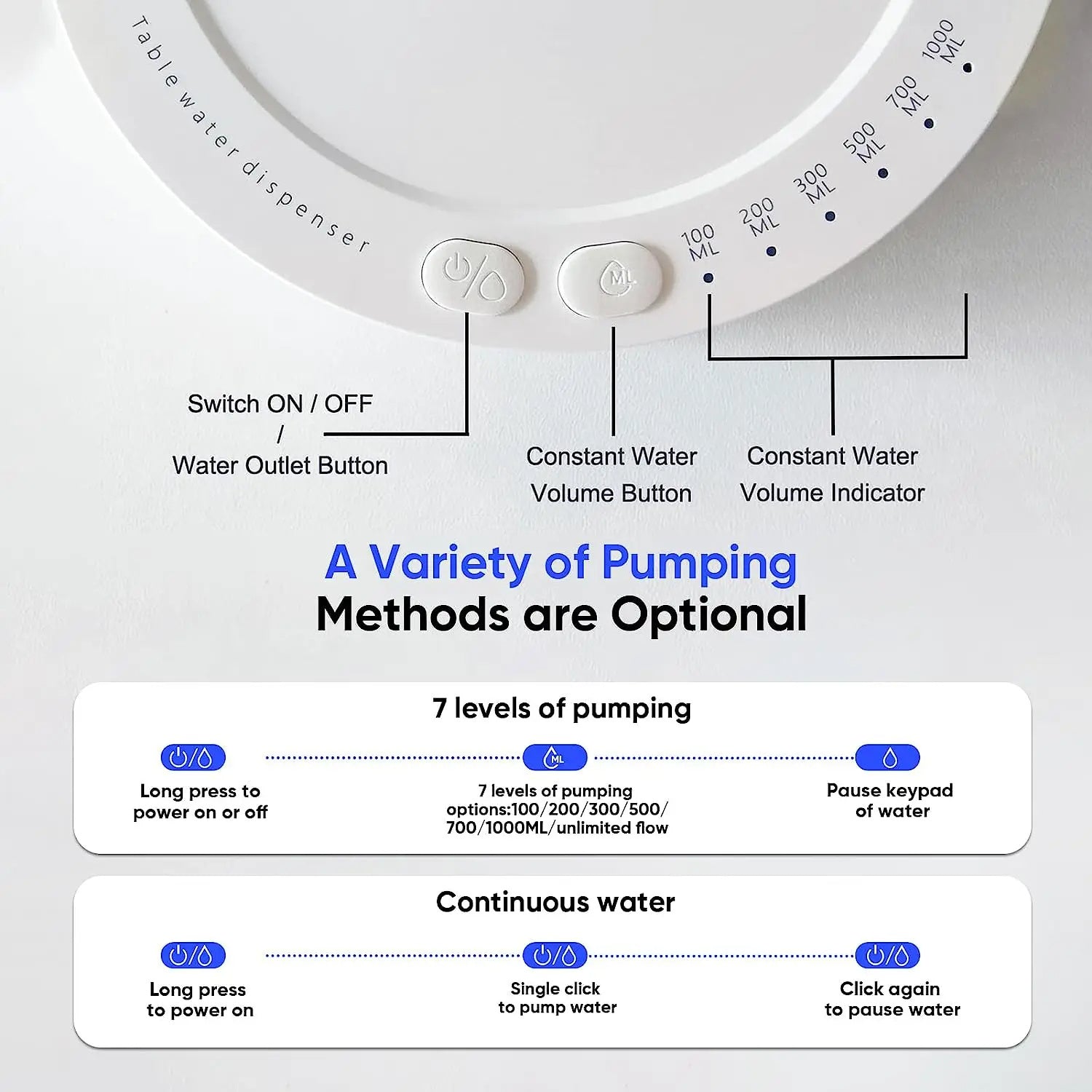 Universal Compatibility: The desktop design of our water dispenser pump is compatible with various sizes and types of water bottles, making it easy to use at home, in the office, or on the go.