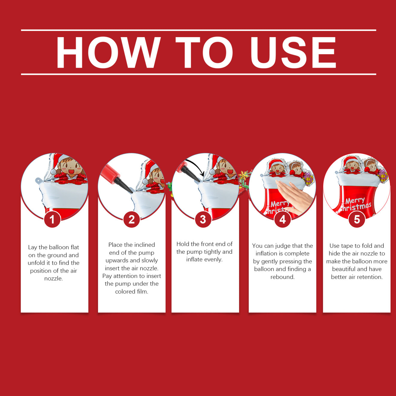 Our Christmas snowman stocking balloons contain nylon aluminum foil. This set of balloons consists of nylon aluminum foil material, puncture resistant, can be inflated for a long time to maintain the perfect shape, not easy to leak, suitable for indoor and outdoor use. Classic Christmas shapes such as Santa Claus, elk, snowman and so on. Add a Christmas atmosphere to your home or party. Its use is simple: put the bevel on the front, as you can judge, fold and hide the air nozzle with tape to make the balloon more beautiful, lay the balloon flat on the ground, open it, and find the location of the air nozzle. Take care to insert the gas cylinder under the colored film. Gently press the cylinder, find the restraint, and inflate it. Better air retention. And the material is thick, self-sealing without leakage. It can be kept for a long time and can decorate the house.