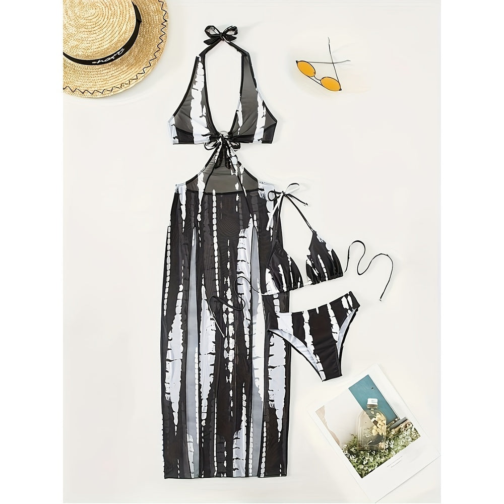 European And American Women's Swimsuit Sunscreen Bikini Three Piece Set Striped Printed Mesh Beach Vacation Sunscreen Swimsuit Women