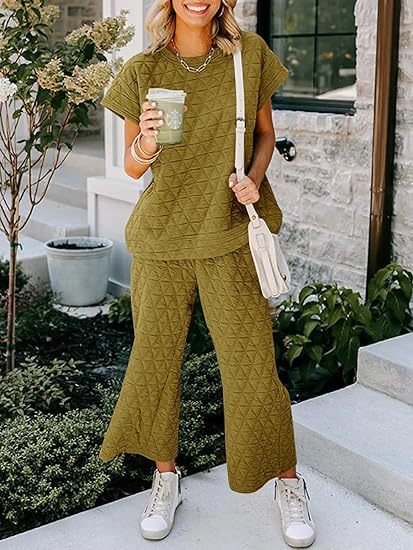 Fazortev Women's 2 Piece Outfits Quilted Lightweight Short Sleeve Tops And Cropped Pants Lounge Set