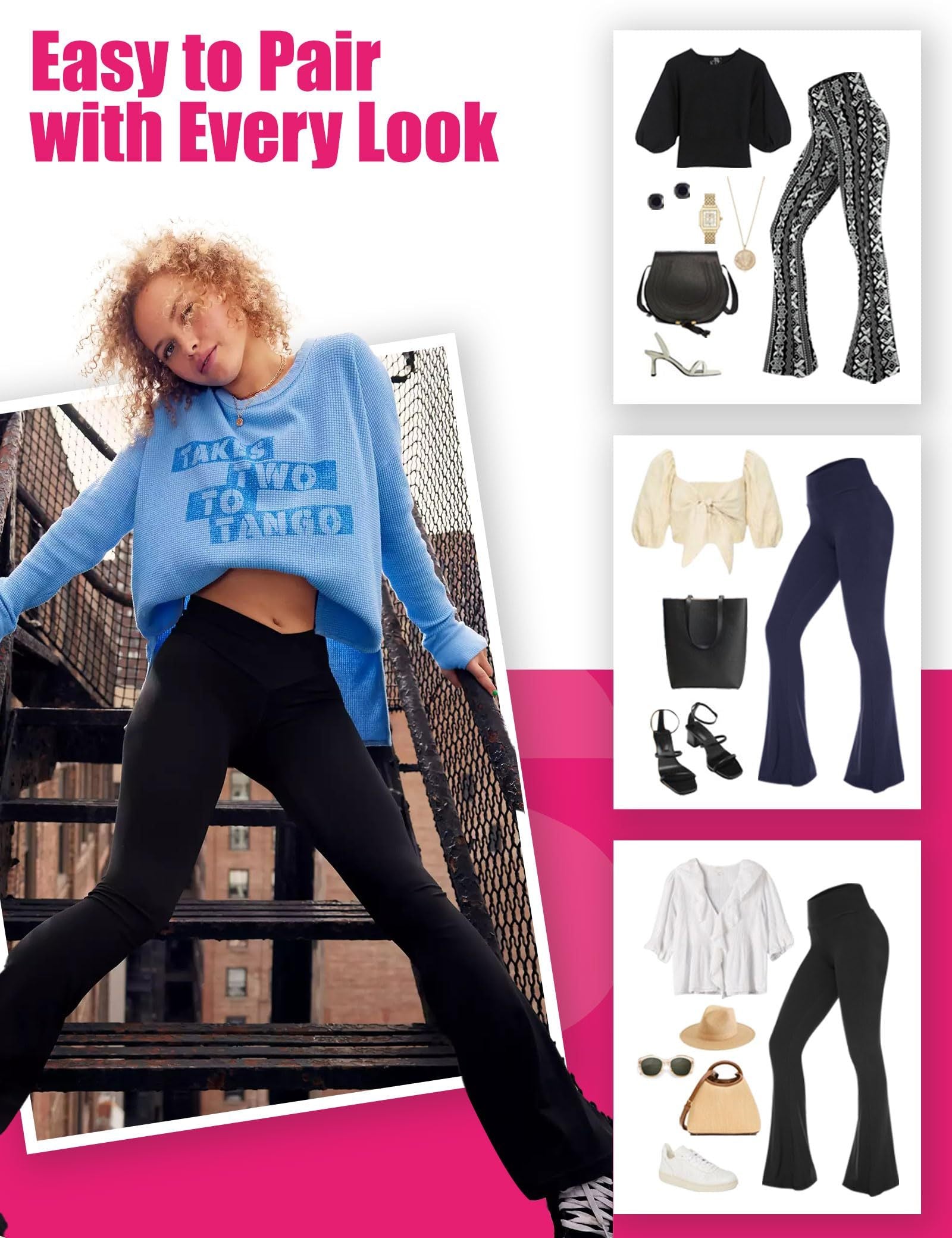 Flared Pants - Cropped Cross Waist Pocket Polyester Double Mill Two Black 2PCS