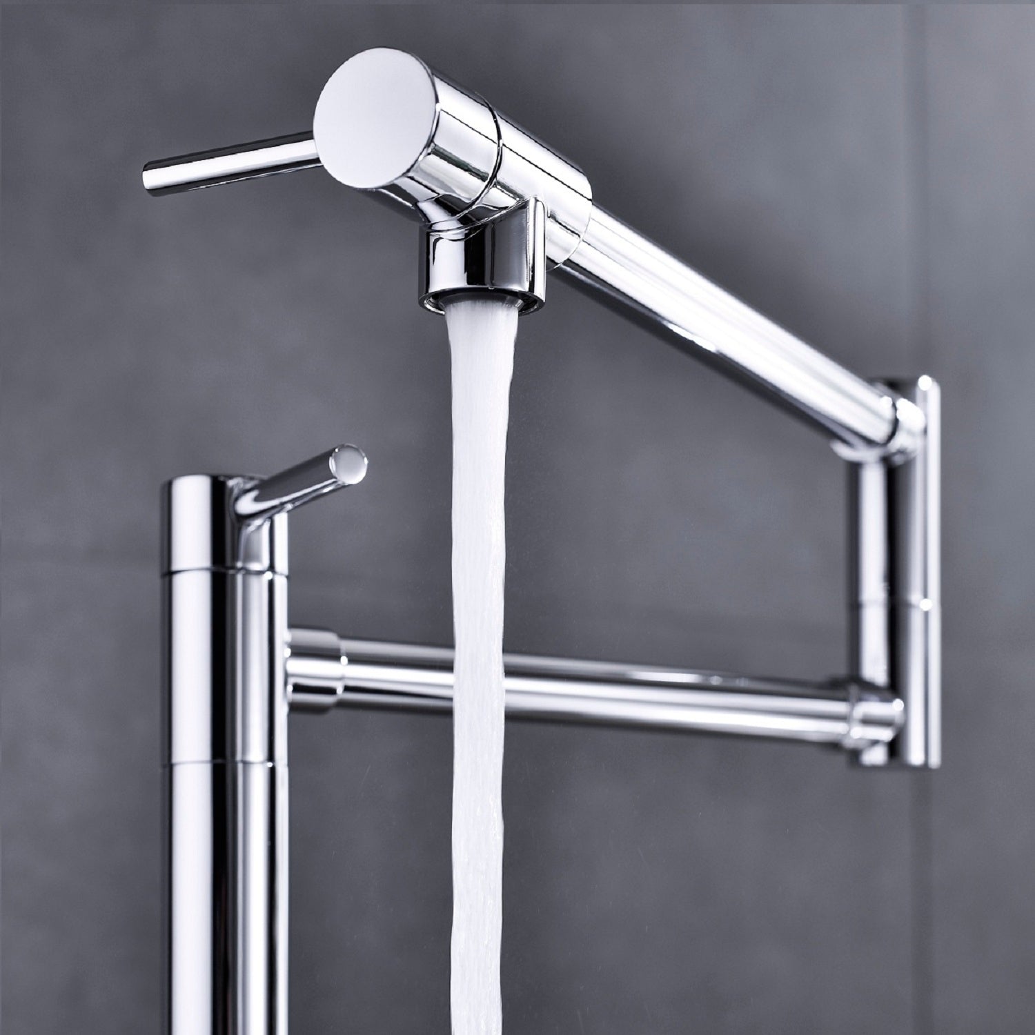The stylish Modern Two Handle Dual Joint Kitchen Pot Filler will instantly upgrade your kitchen. Its contemporary design combines form and all-in-one function in a sleek modern package. The faucet's retractable arm is the perfect height to quickly fill pots on a countertop or in the sink. Comfortable ergonomic design with two on-off handles for easy control and operation. Both swivel joints rotate 360° and supply a full range of water access. The brushed nickel finish is beautiful and simple to keep clean and stain-free. Brass construction with superior stain resistance requires minimal maintenance. Space saving modern design folds when not in use. Single hole set up for easy installation