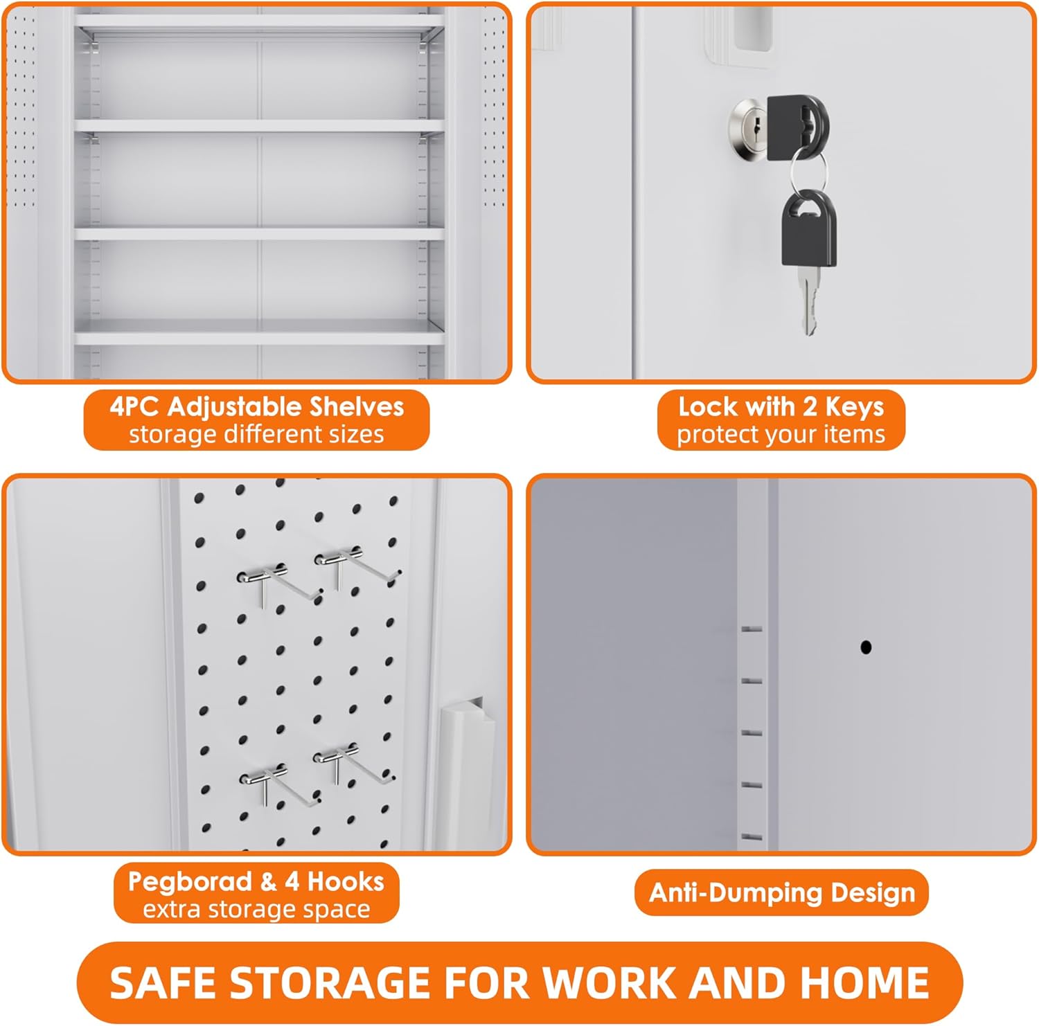 - High Security - Built-in three-point lock system, lock rod hidden inside the cabinet door, safe, beautiful, feels light, no maintenance. The metal garage cabinet is equipped with 2 keys to help keep important items safe.