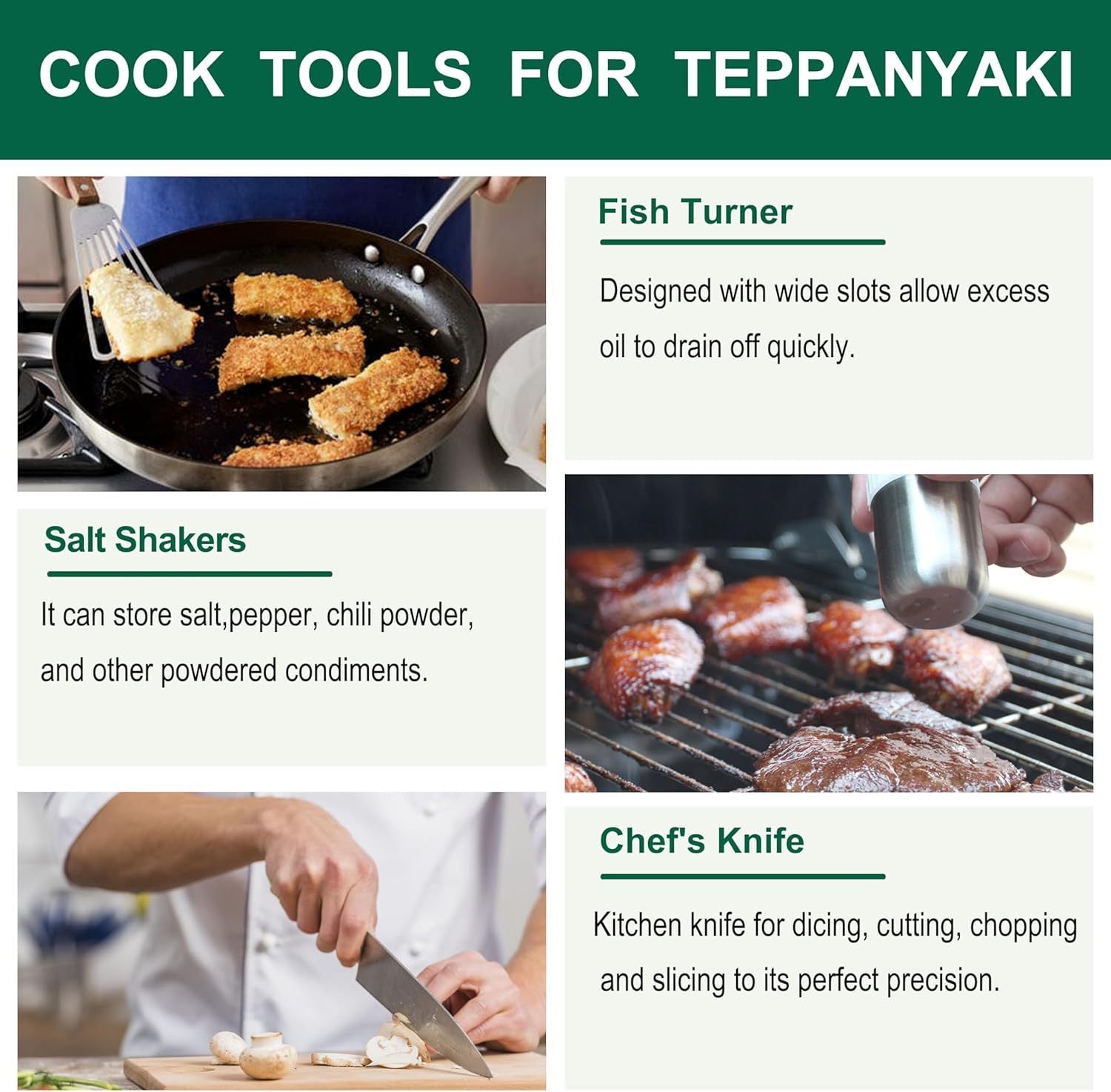 - Premium Quality Griddle Tools - Made of high quality stainless steel with fingerprint design plastic handle provides a firm and comfortable grip. Do not worry about your grill tools loosening, breaking or creaking. Hanging hole for easy storage. This high performance griddle spatula set is suitable for a variety of cooking purposes and is a must for Hibachi and electric Teppanyaki grills. Dishwasher safe.