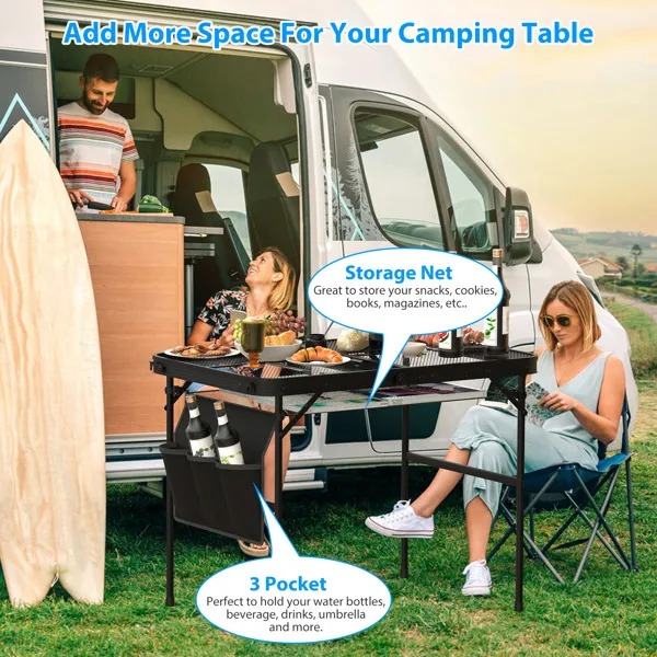- Add Space For Camping Table: This hanging storage net is specially designed for 35.43x23.62 camping table with 0.89in-diameter side pole.