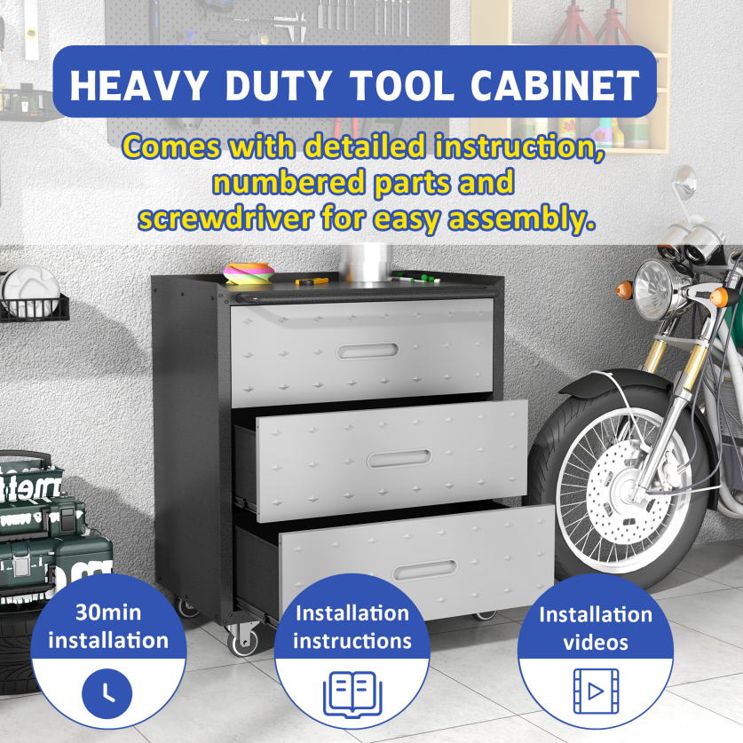 Heavy-Duty Metal Storage Cabinet With Wheels - 3 Drawer Tool Cabinet For Garage, Office, And Home Organizer Solutions, Black Gray