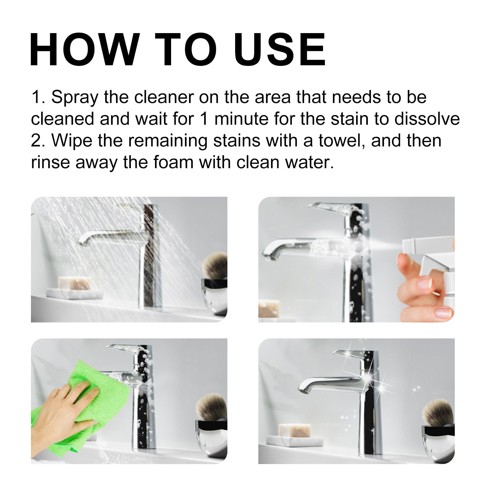 Our bathroom foam cleaner contains disodium EDTA, sodium bicarbonate, and laureth-7. It can remove all kinds of dirt, such as soap scum, limescale and other daily dirt, keep the bathroom clean and hygienic, and the decontamination effect is obvious. Just rinse it off with clean water to keep your bathroom clean, bright and fresh. The way to use it is very simple: spray the detergent on the area that needs to be cleaned, wait 1 minute for the stain to dissolve, wipe off the remaining stain with a towel, and rinse off the foam with clean water. It can easily remove limescale and stains, saving time and effort, and giving your bathroom a new look.