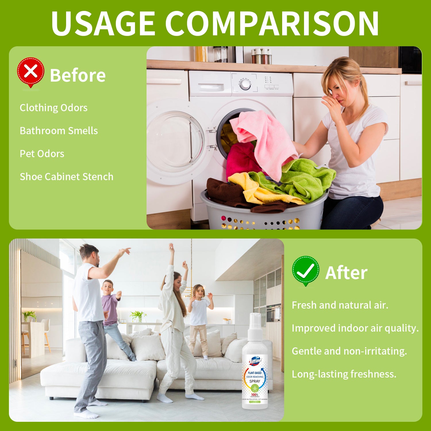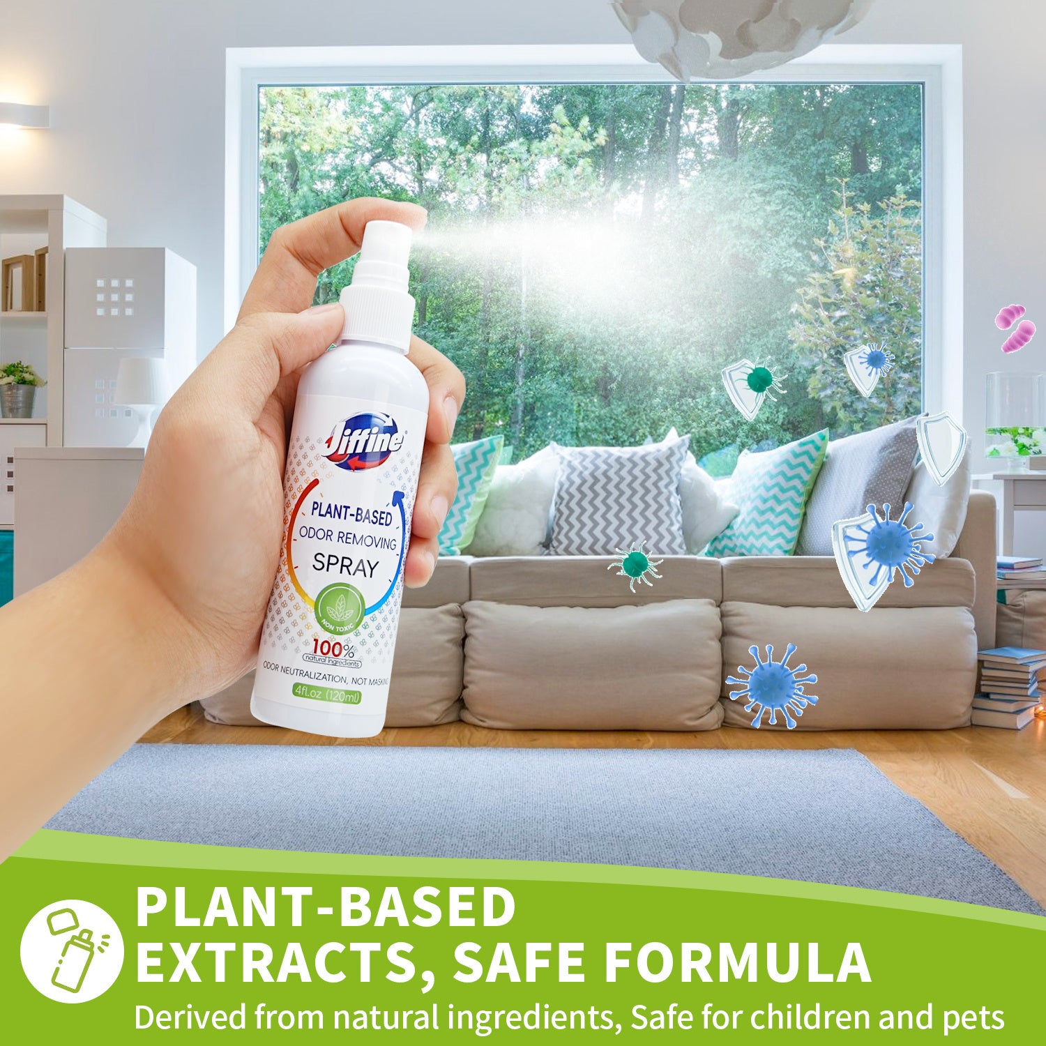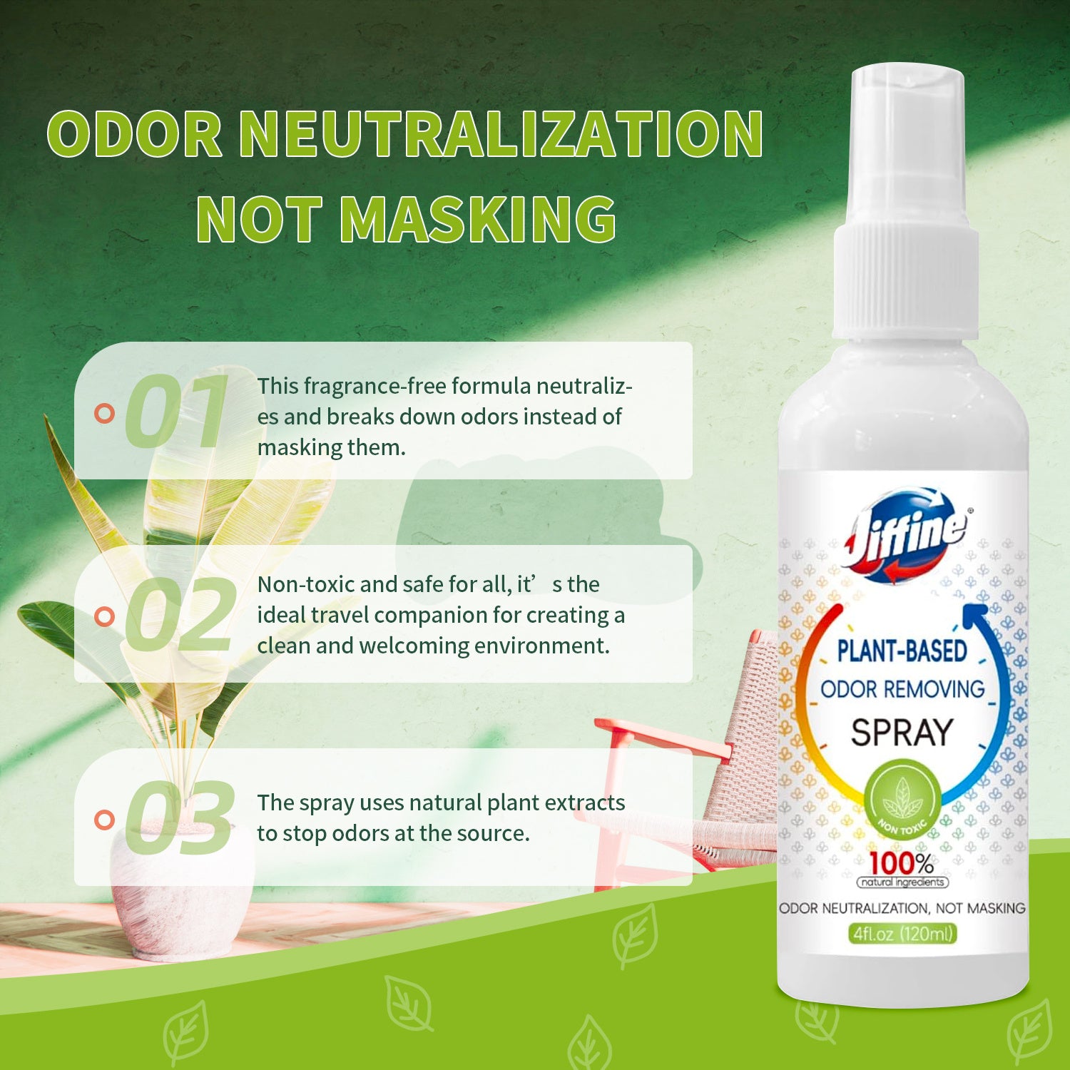 Jiffine Plant-Based Deodorizing Spray, an unscented natural deodorizer. A natural blend of castor oil extract and unripe persimmon extract. A quick spray neutralizes odors by breaking down the source, rather than masking them. It removes odors from clothing, rooms, refrigerators, or after grilling. Convenient for travel, it can be used anytime to freshen up gear, clothes, and shoes.
