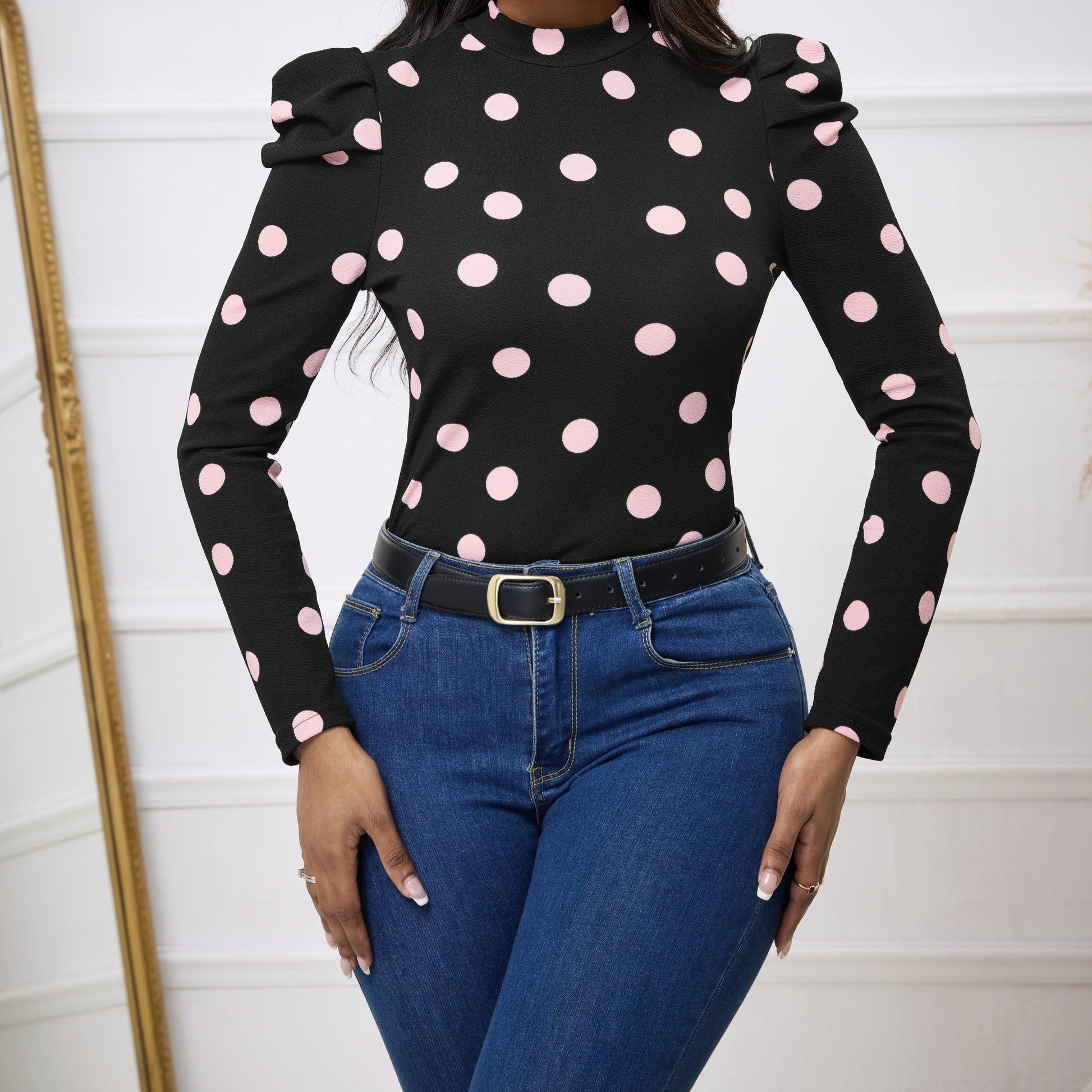 Ladies' Polka Dot Print Slim Fit Figure Enhancing Basic Versatile Elegant T-shirt
