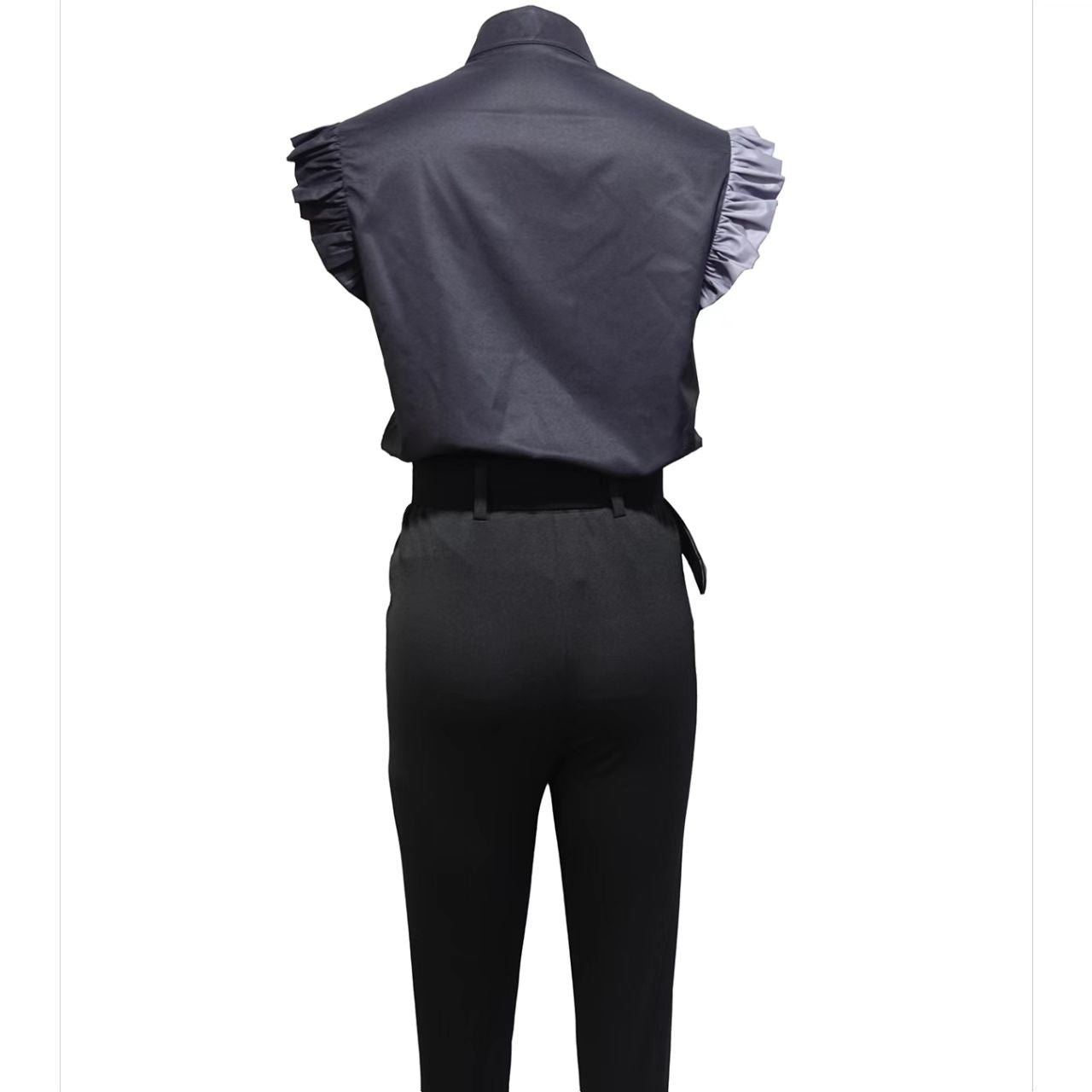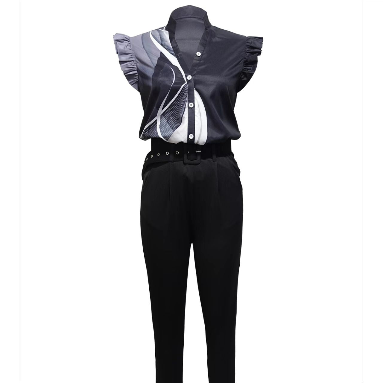 Ladies' V-neck Button Up Petal Sleeve Printed Off Shoulder Shirt Set