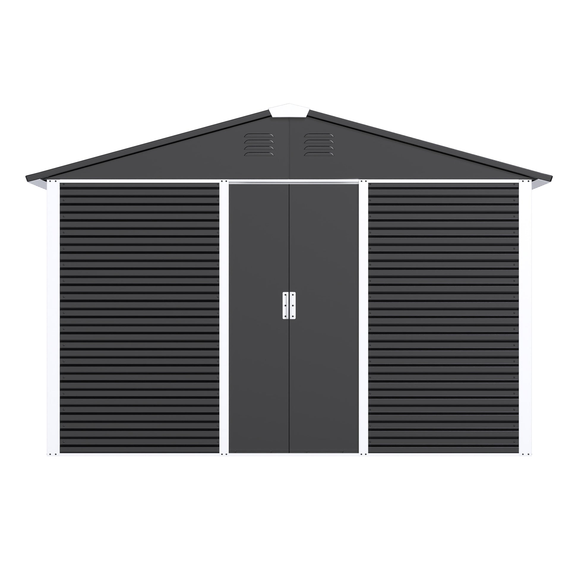 · Recesses and sliding doors: the overall panels of the metal outdoor storage shed are designed with grooves to help drain water and prevent moisture from the tools stored in the storage shed, the dual sliding doors are also designed for easier access, sliding the doors open and closed to save more storage space