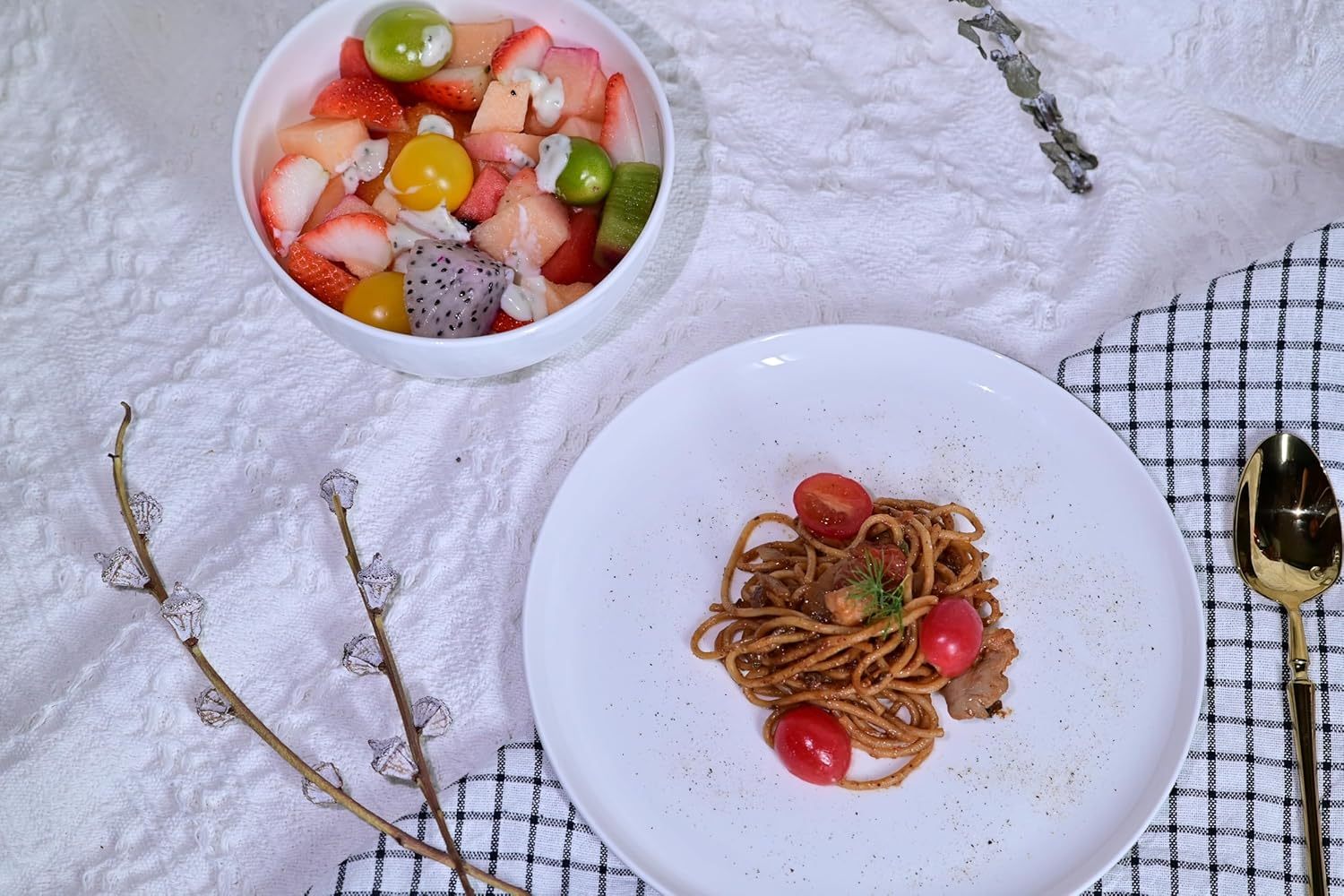 - LILY 16-PIECE SET: This set offers service for 4, including four 11-inch dinner plates, four 9.25-inch salad plates, four 8-inch pasta plates, and four 6-inch cereal bowls.
