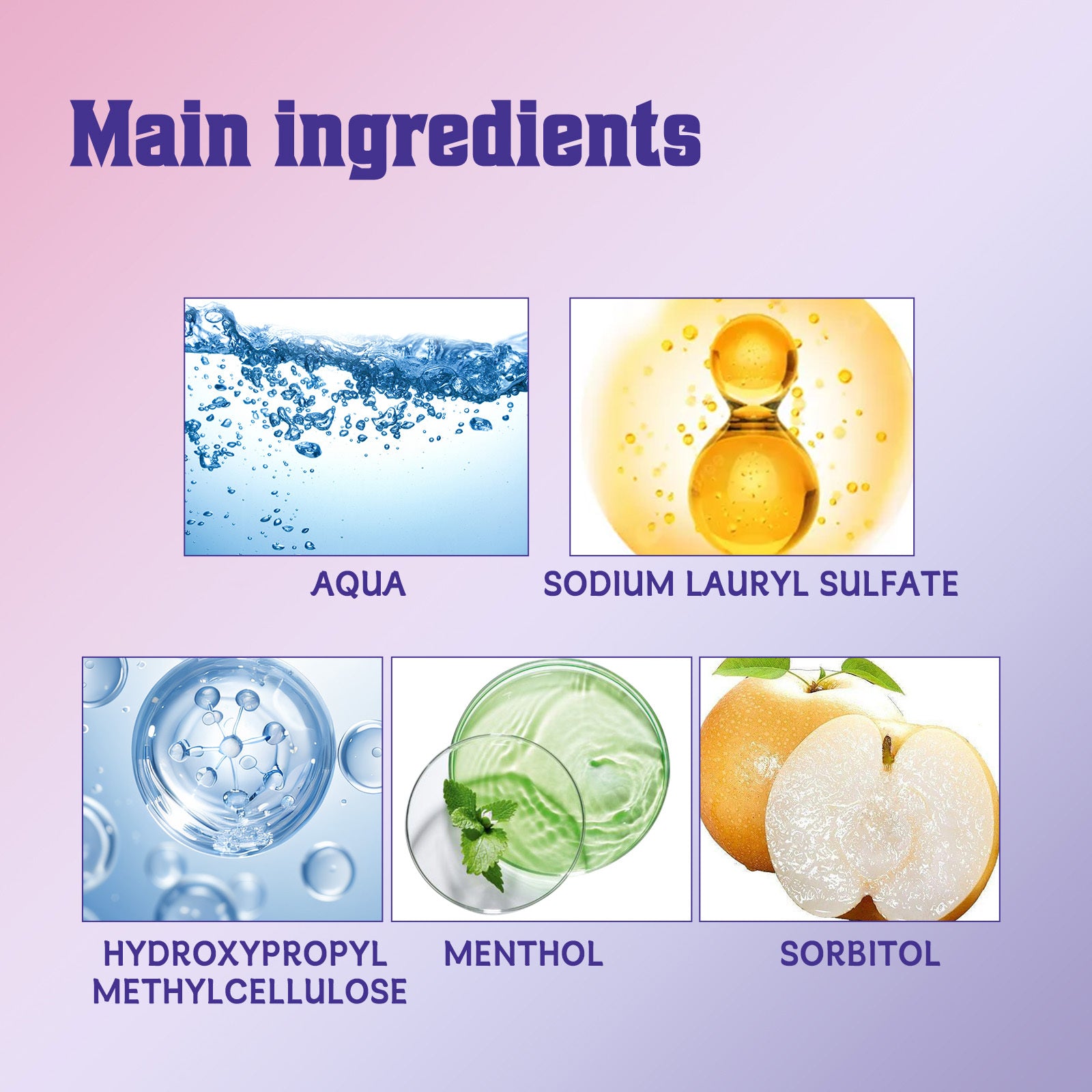 Our Purple Tooth whitening toothpaste contains menthol and sorbitol. It can gentle sensitive teeth and gums without stripping the enamel or irritating the gums, can more naturally neutralize the yellow color on the teeth, hide stains, increase brightness, and restore vitality. Its use method is very simple: after normal brushing, squeeze the appropriate amount of this product on the toothbrush, brush gently for 1-2 minutes, and rinse thoroughly with water. Restore natural brightness of teeth, clean tooth stains, freshen breath, care for white gums.
