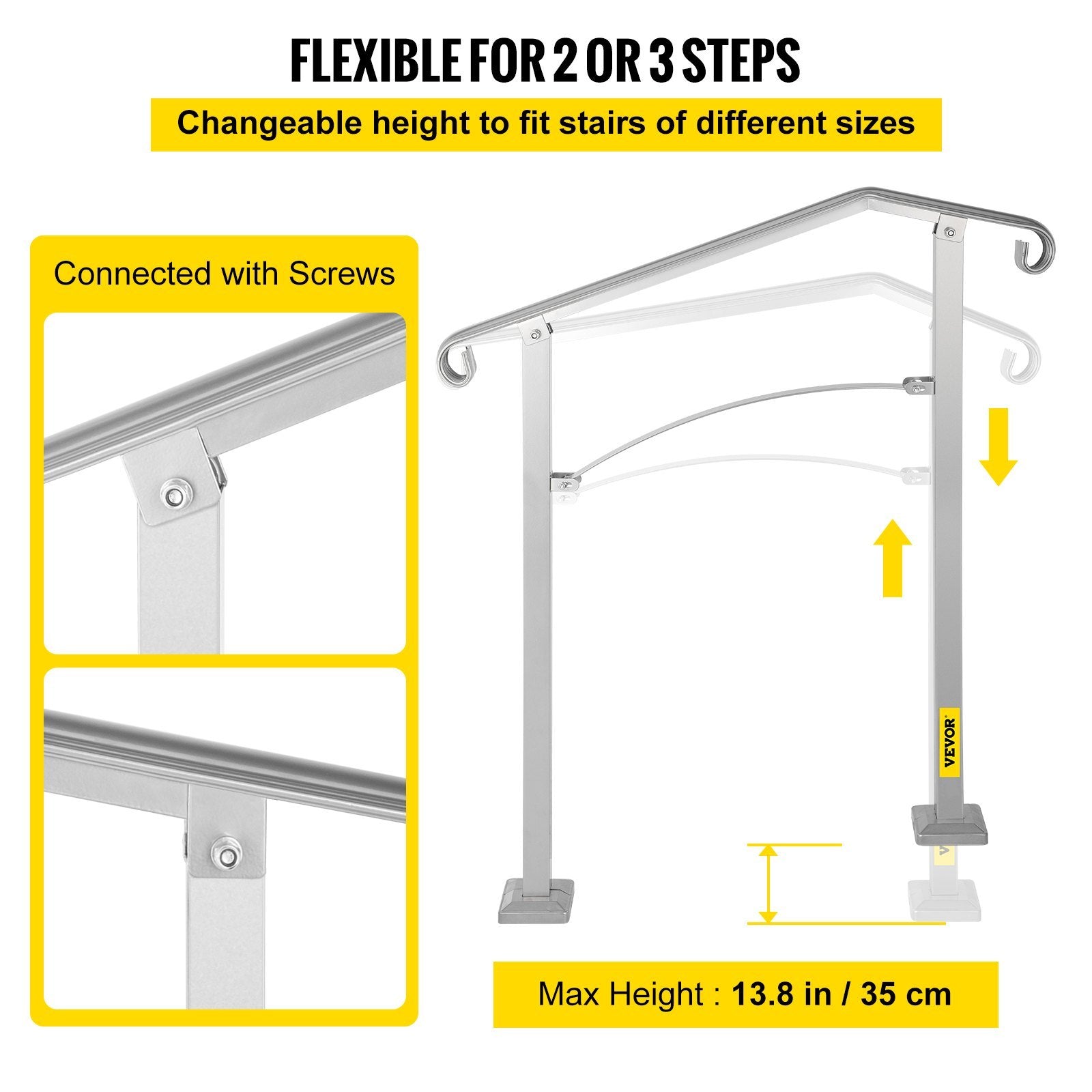 Outdoor Stair Railing, Fit 2 Or 3 Steps Alloy Metal Handrailing, Front Porch Flexible Transitional Handrail, Arch Step Rail With Installation Kit, For Concrete Or Wooden Stairs, Silver