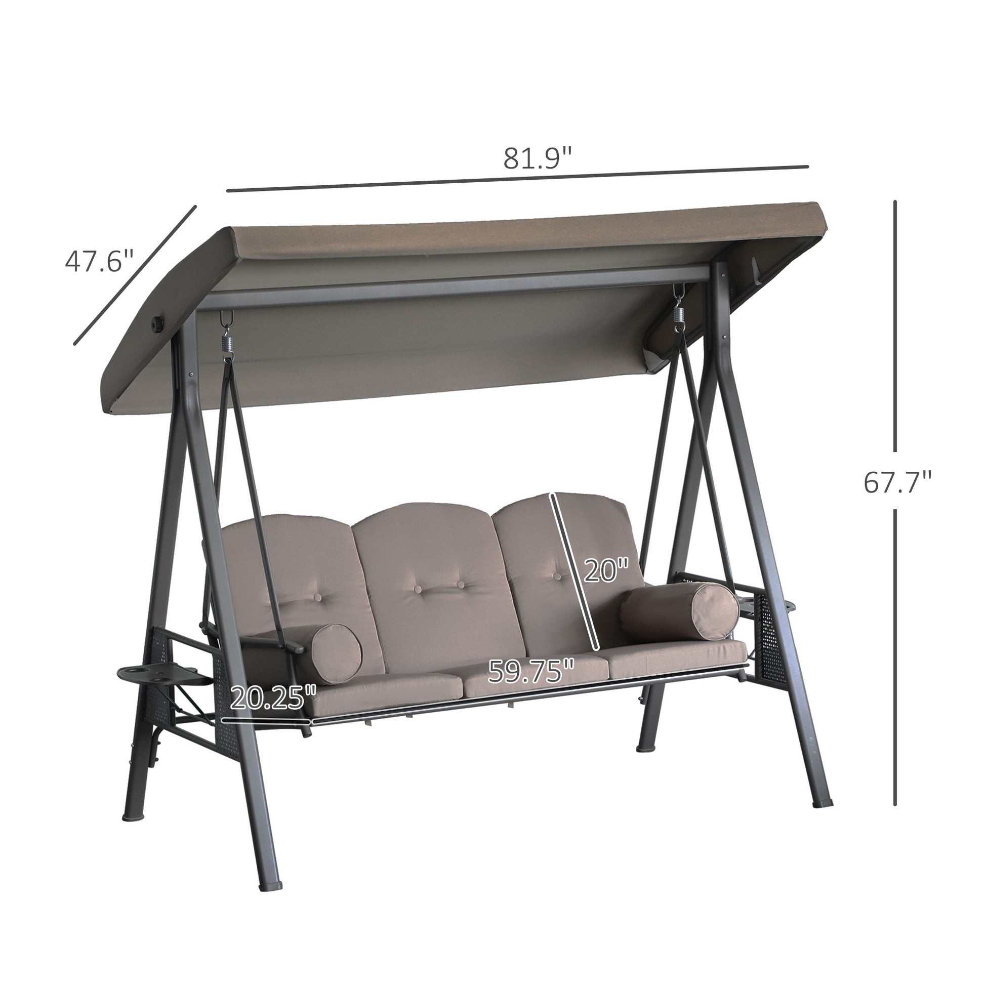 Patio Swing Bench 3-Person Steel Canopy Cushioned With Side Trays Comfortable Brown