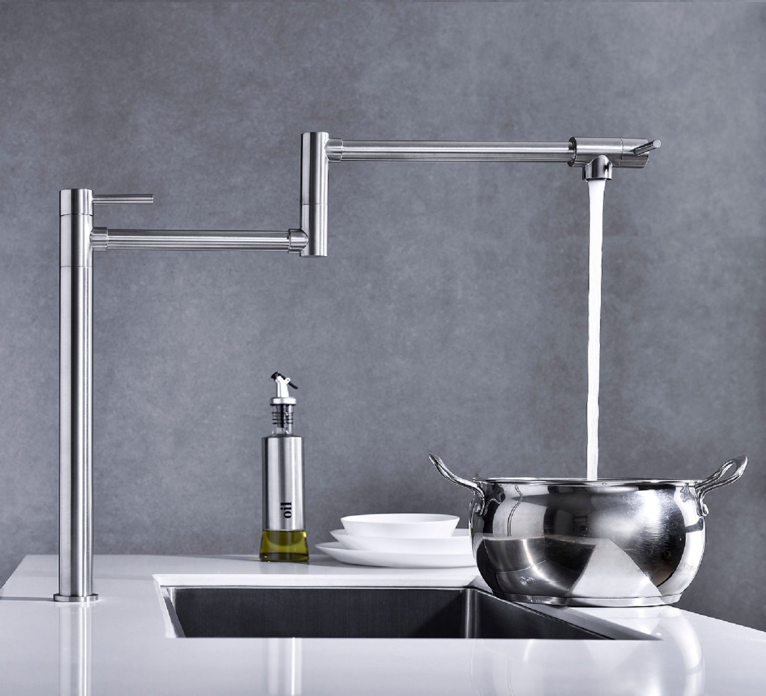 The stylish Modern Two Handle Dual Joint Kitchen Pot Filler will instantly upgrade your kitchen. Its contemporary design combines form and all-in-one function in a sleek modern package. The faucet's retractable arm is the perfect height to quickly fill pots on a countertop or in the sink. Comfortable ergonomic design with two on-off handles for easy control and operation. Both swivel joints rotate 360° and supply a full range of water access. The brushed nickel finish is beautiful and simple to keep clean and stain-free. Brass construction with superior stain resistance requires minimal maintenance. Space saving modern design folds when not in use. Single hole set up for easy installation