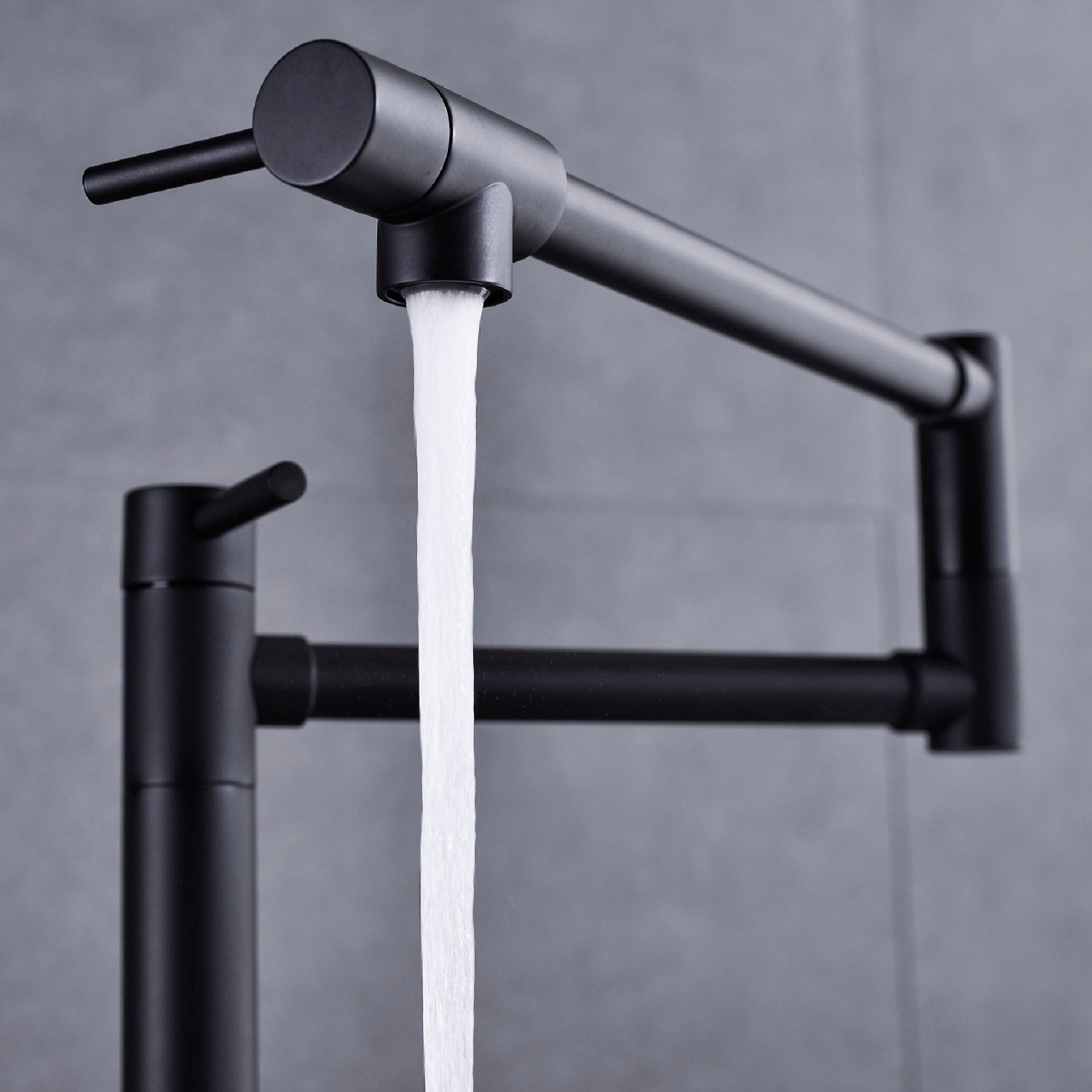 The stylish Modern Two Handle Dual Joint Kitchen Pot Filler will instantly upgrade your kitchen. Its contemporary design combines form and all-in-one function in a sleek modern package. The faucet's retractable arm is the perfect height to quickly fill pots on a countertop or in the sink. Comfortable ergonomic design with two on-off handles for easy control and operation. Both swivel joints rotate 360° and supply a full range of water access. The brushed nickel finish is beautiful and simple to keep clean and stain-free. Brass construction with superior stain resistance requires minimal maintenance. Space saving modern design folds when not in use. Single hole set up for easy installation