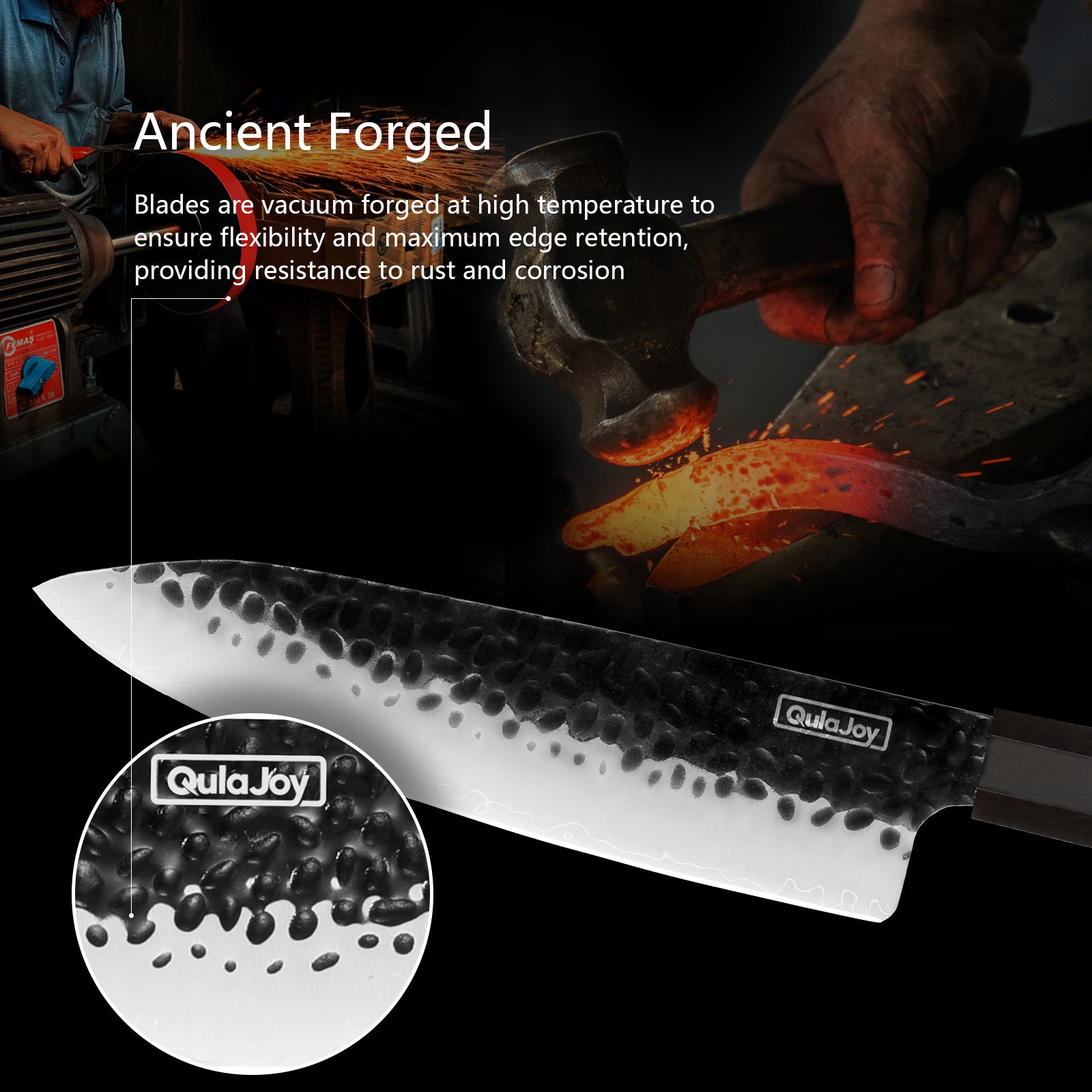 - A Breathtaking Blade: This professional kitchen masterpiece is made of 9cr18mov, forged and manufactured with modern technology and traditional craftsmanship, the blade is vacuum high temperature and deep cold temperature treated to ensure flexibility and maximum edge retention, providing rust and Corrosion ability. Wet hand grinding for less resistance. With a Rockwell hardness of 60 or higher, the edges are not prone to chipping or splitting.