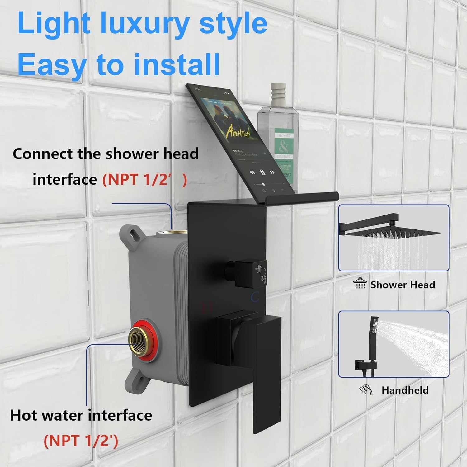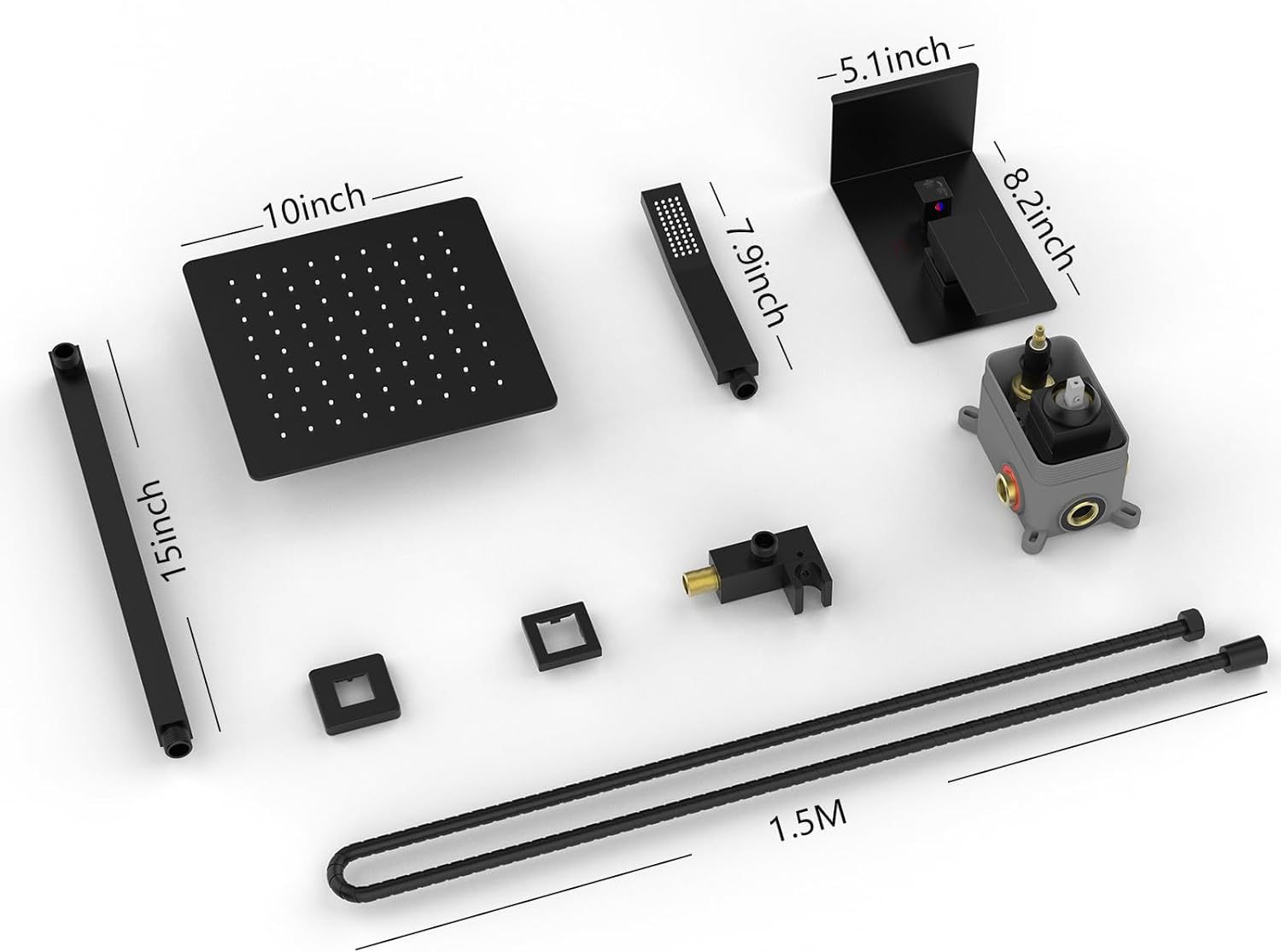Included Components 1.5 meter shower water inlet hose, Cold and hot control handle, Control valve box, handheld shower nozzle, shower bracket, 10 inch square shower nozzle, 15 inch shower arm