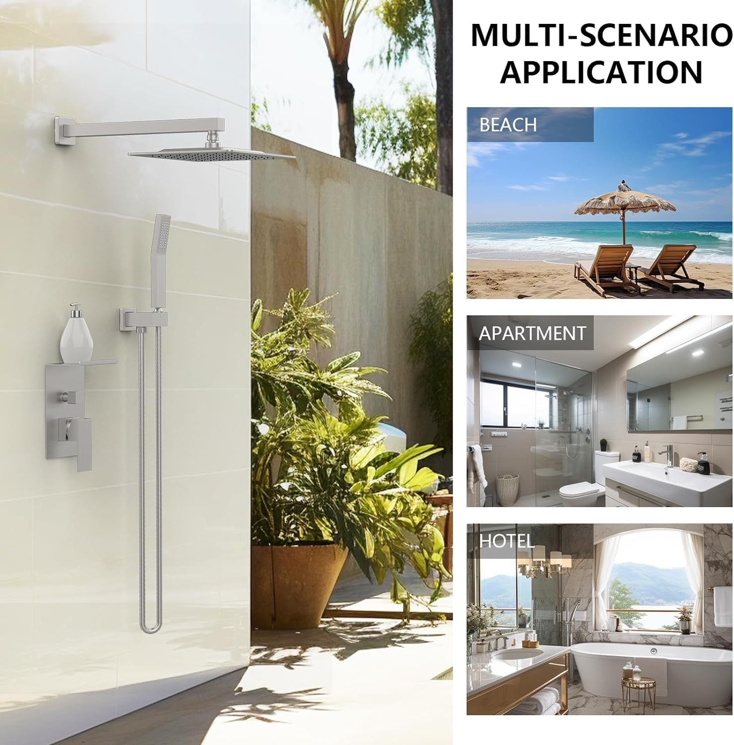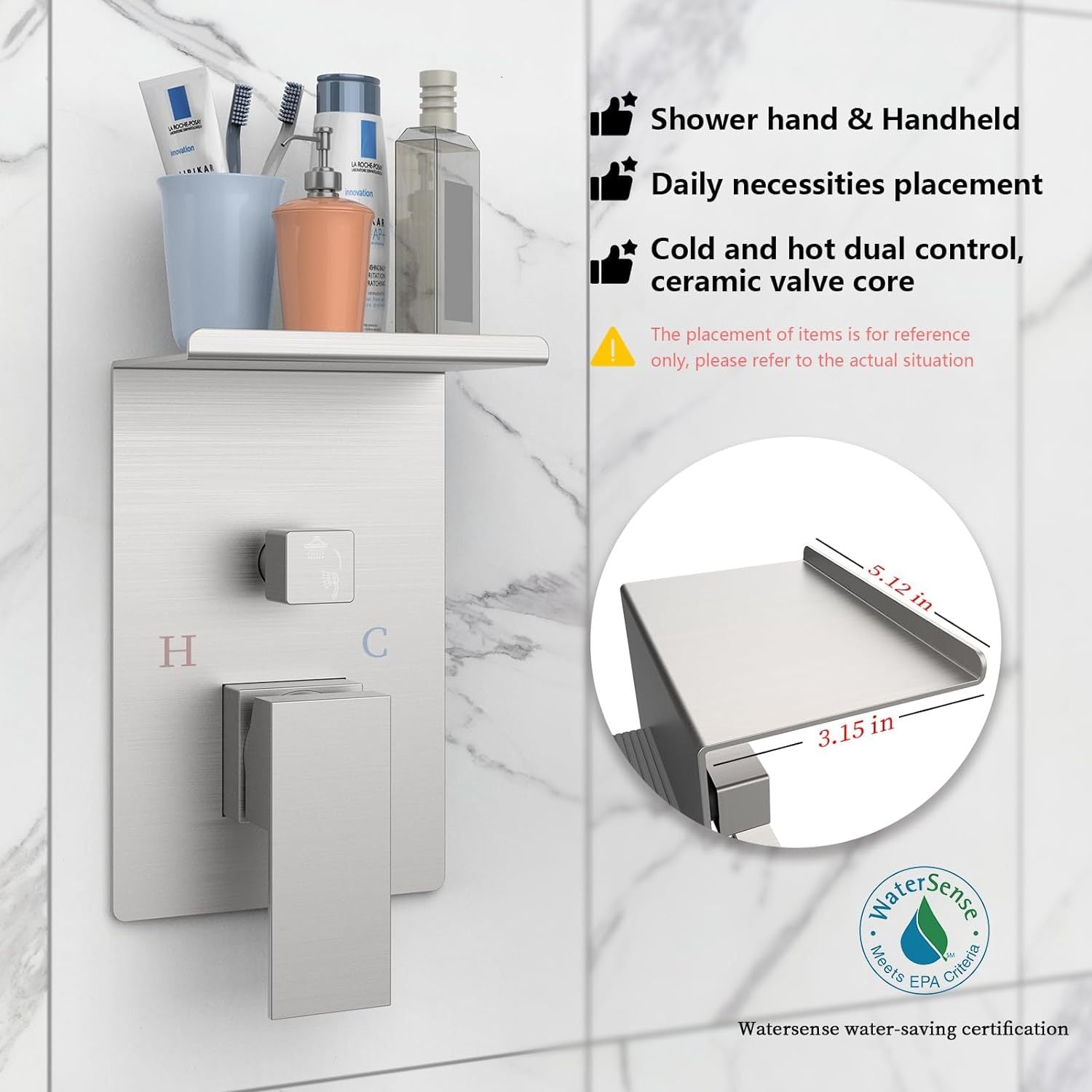Included Components 1.5 meter shower water inlet hose, Cold and hot control handle, Control valve box, handheld shower nozzle, shower bracket, 10 inch square shower nozzle, 15 inch shower arm