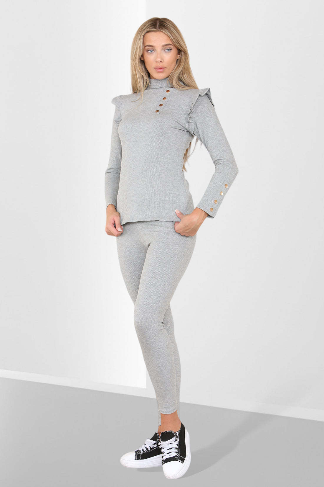 Side Buttons Frill Shoulder Side Neck Gold Button Detail Two Piece Loungewear Set