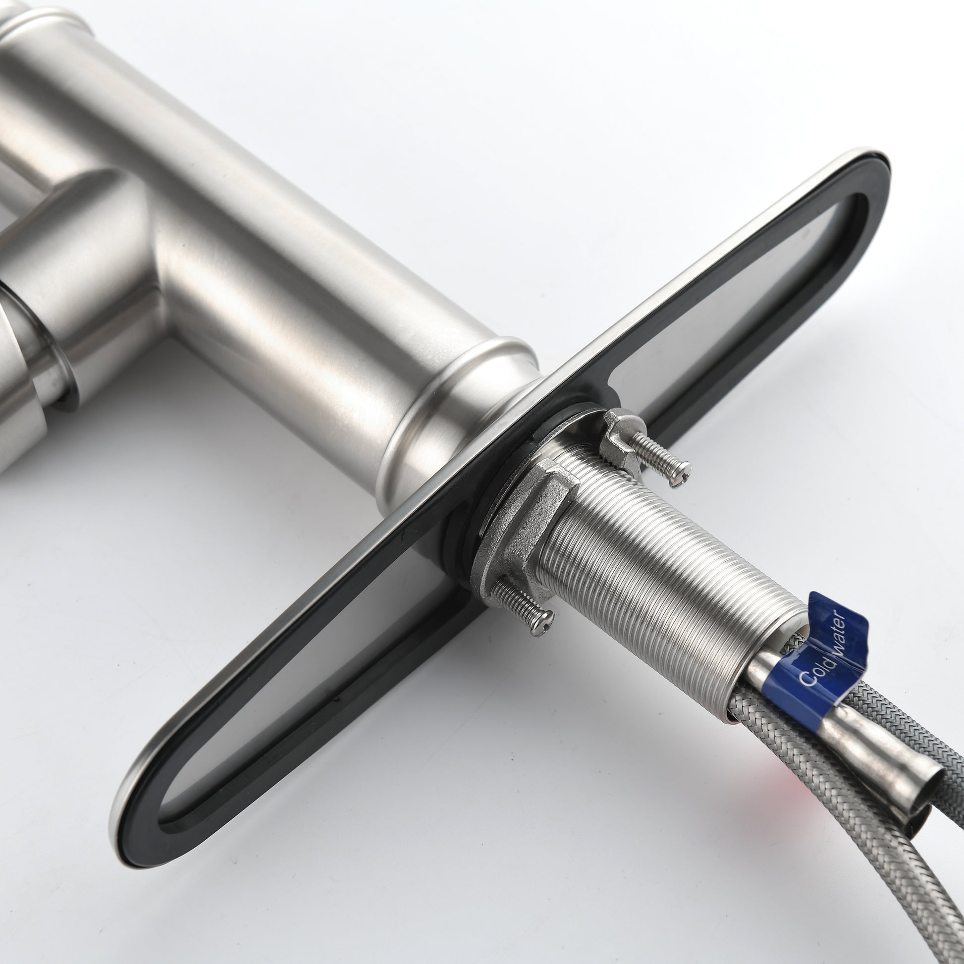 Easy to Operate---Single handle control water temperature and flow volume easily,high arc 360 degree swivel spout supply full range washing access, sprayer head always retract back to spout after each use.