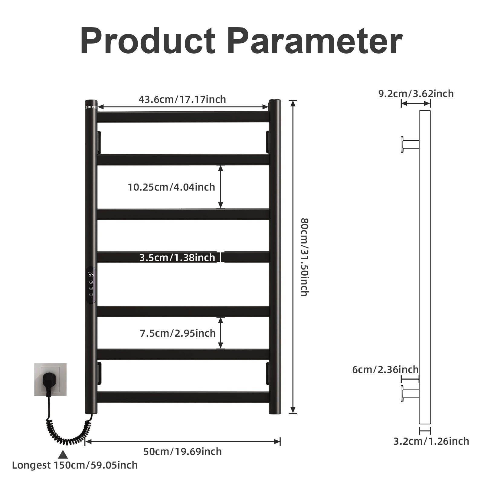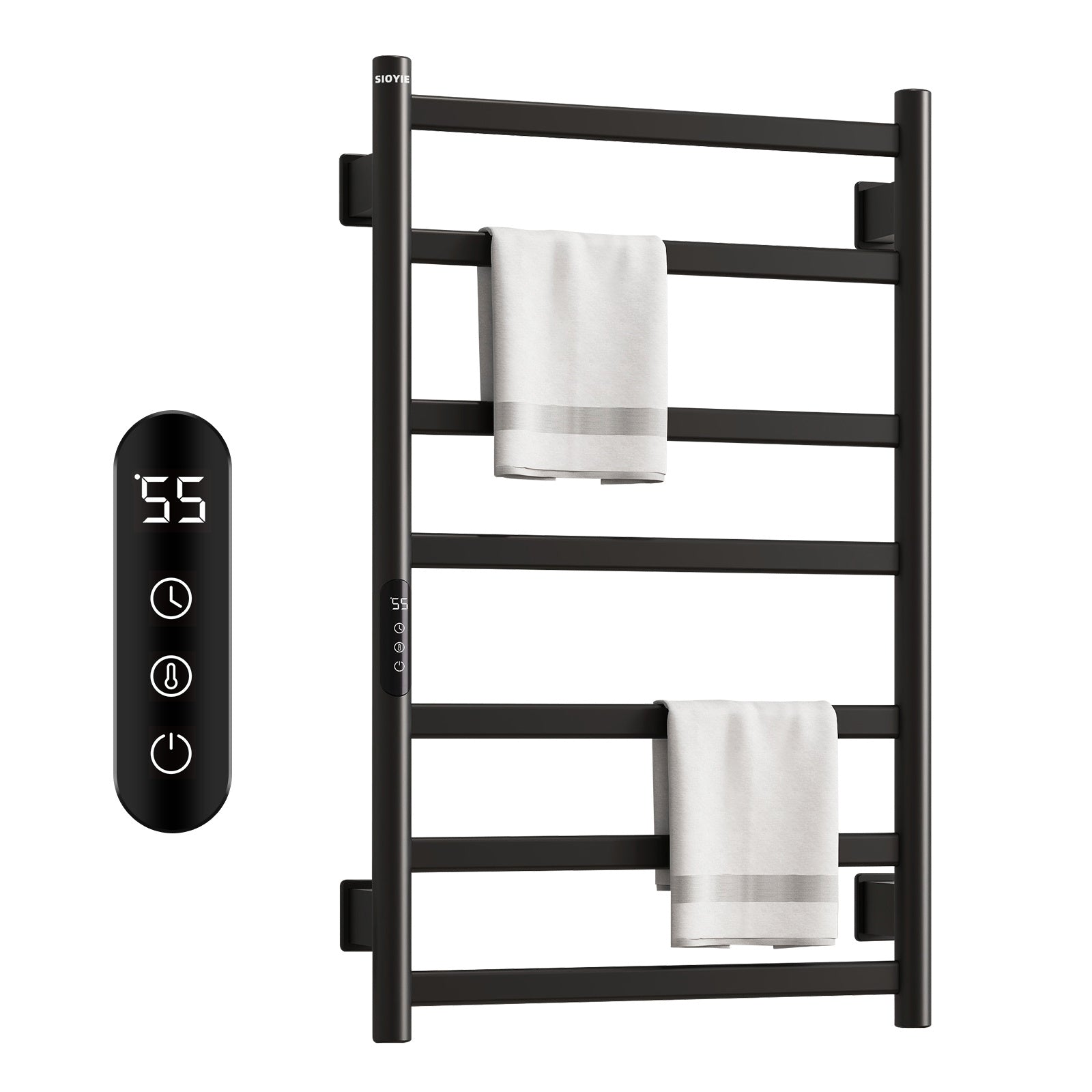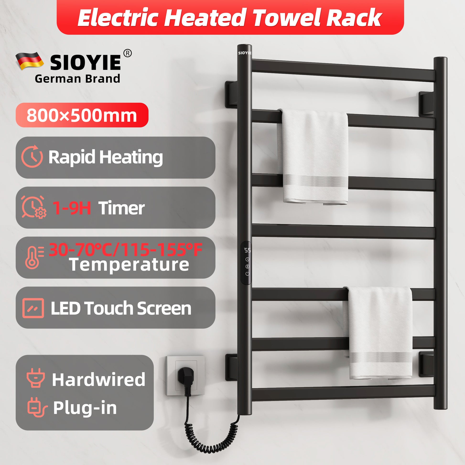 SIOYIE Towel Warmer Bathroom Wall Mounted 6 Bars Electric Towel Drying, 150 W 500 800 MM Heated Towel Rack With Intelligent Touch Screen Timer And Temperature Control Black Left