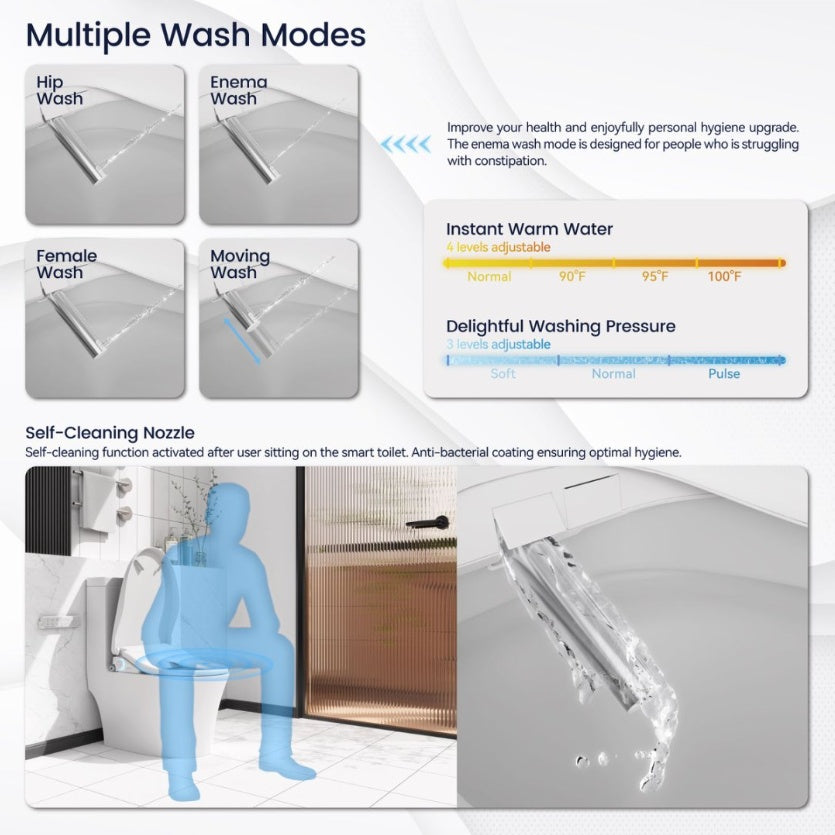 Self-Cleaning Nozzle: Self-cleaning function activated after user sitting on the smart toilet.Anti-bacterial coating ensuring optimal hygiene.