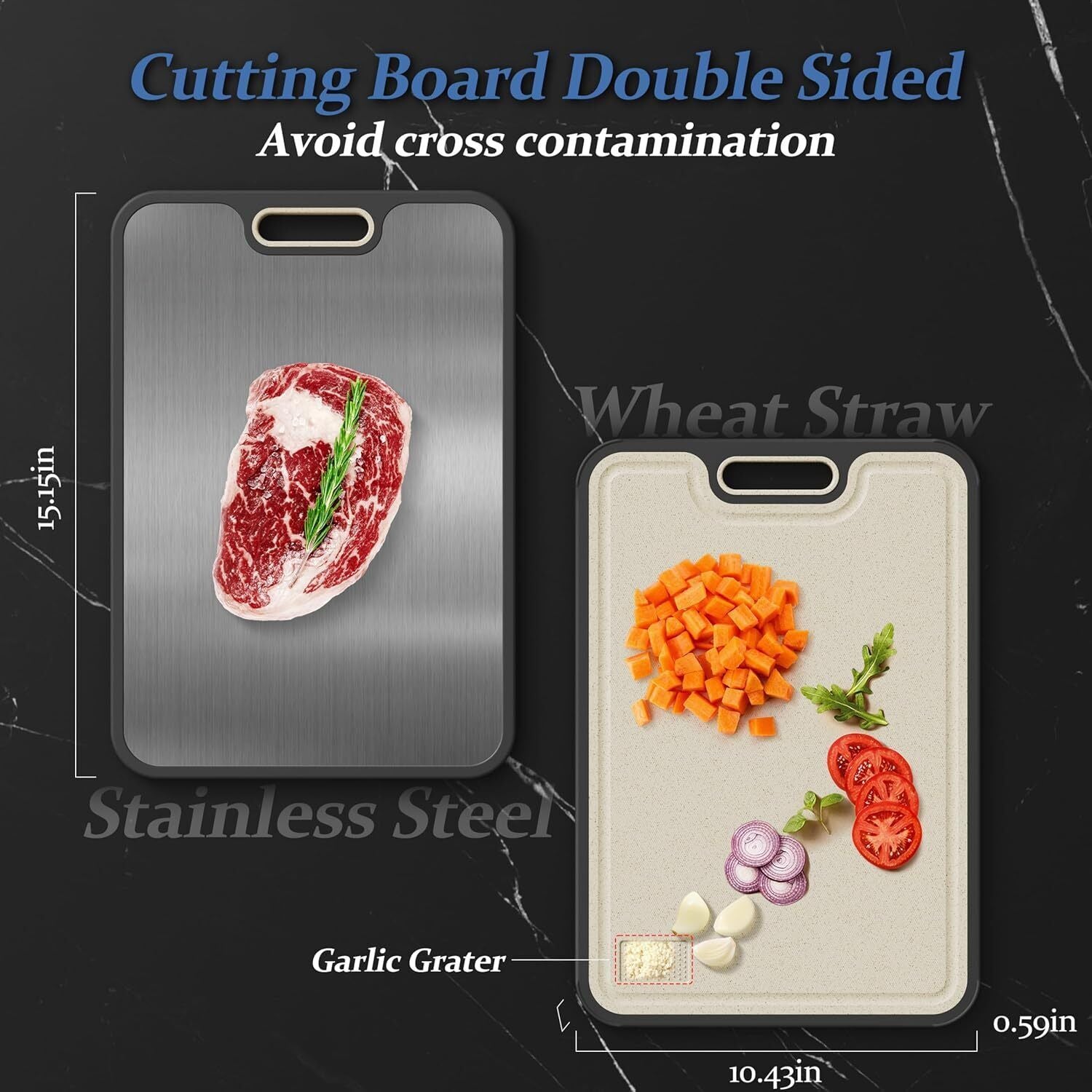 - ãFood-Grade MaterialsãOne side is crafted from robust stainless steel for meat chopping board, while the other side features wheat straw PP, ideal for all your fruit and vegetable prep