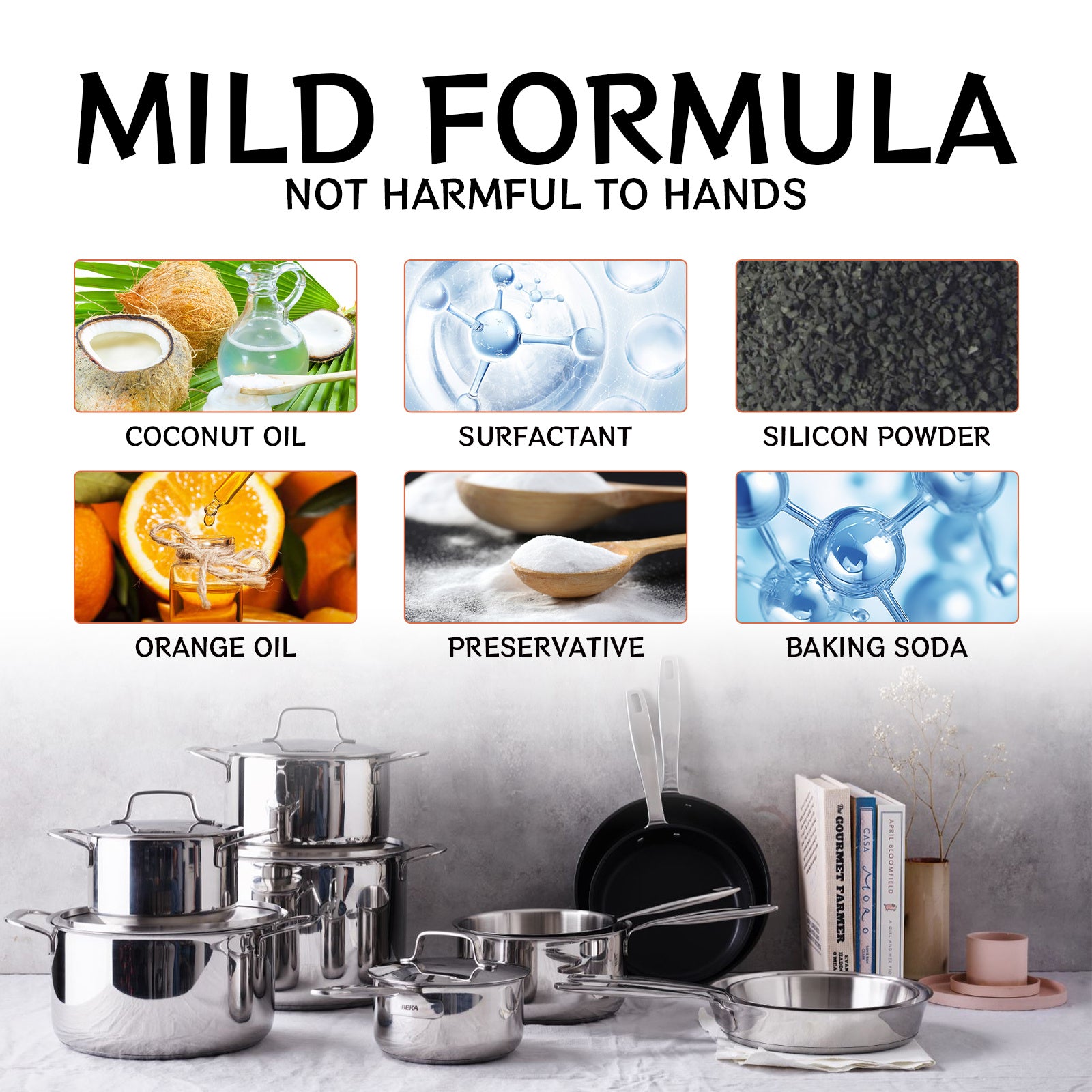 Our cookware cleaner contains coconut oil, surfactants and silica powder. It can quickly penetrate and break down stubborn oils, oxidation and rust on stainless steel surfaces and kitchen utensils. The way to use it is very simple: take a proper amount of this product with a damp cloth, wipe it clean on the cooker, you can add water to the container to soften it, and then continue to use. And you can clean cooking utensils.