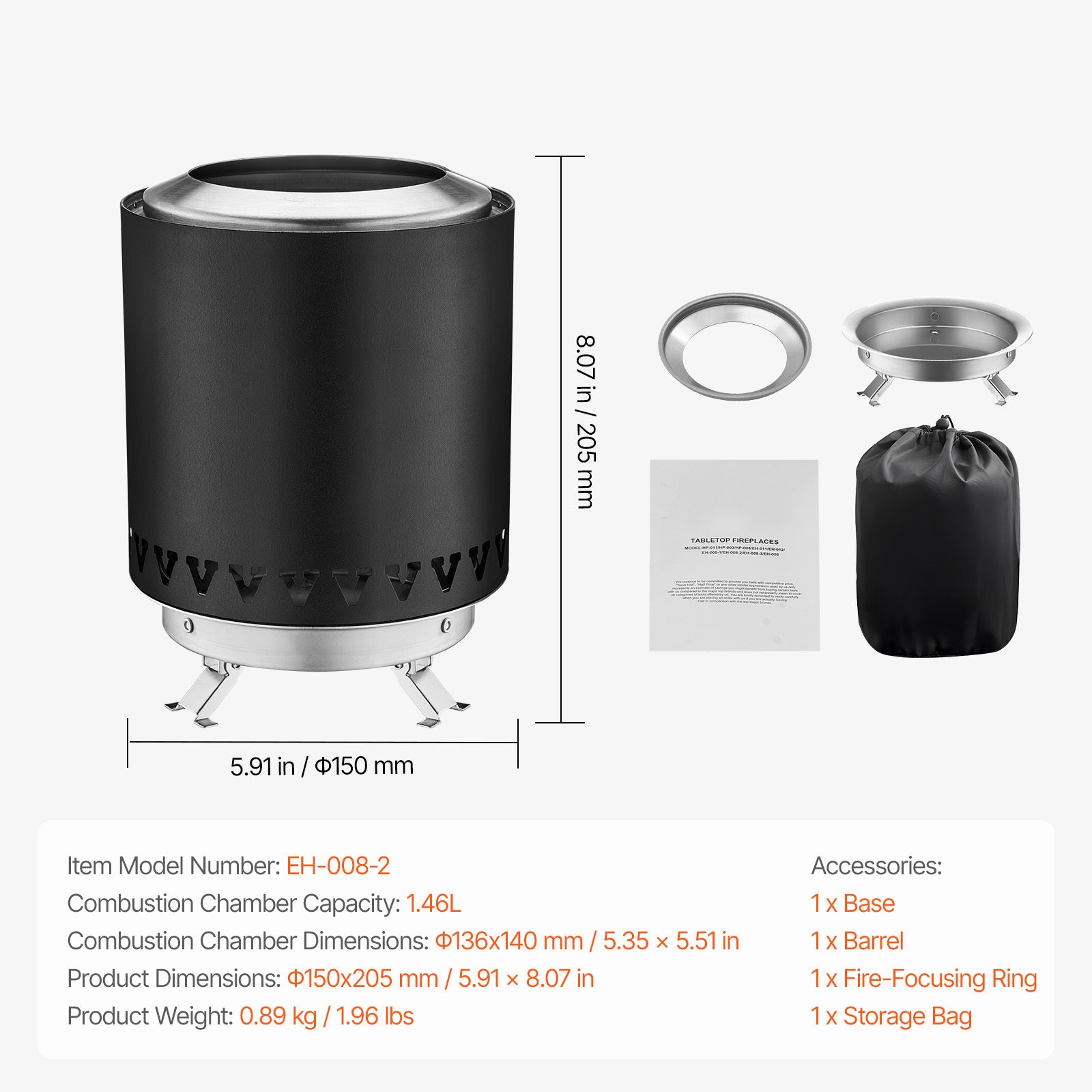 Tabletop Fire Pit 6 Inch Stainless Steel Fireplace Indoor Outdoor Black