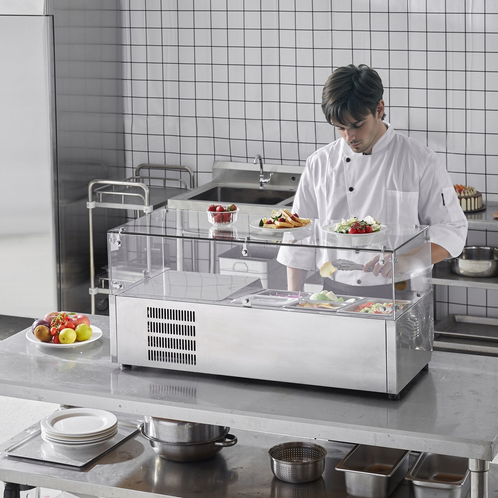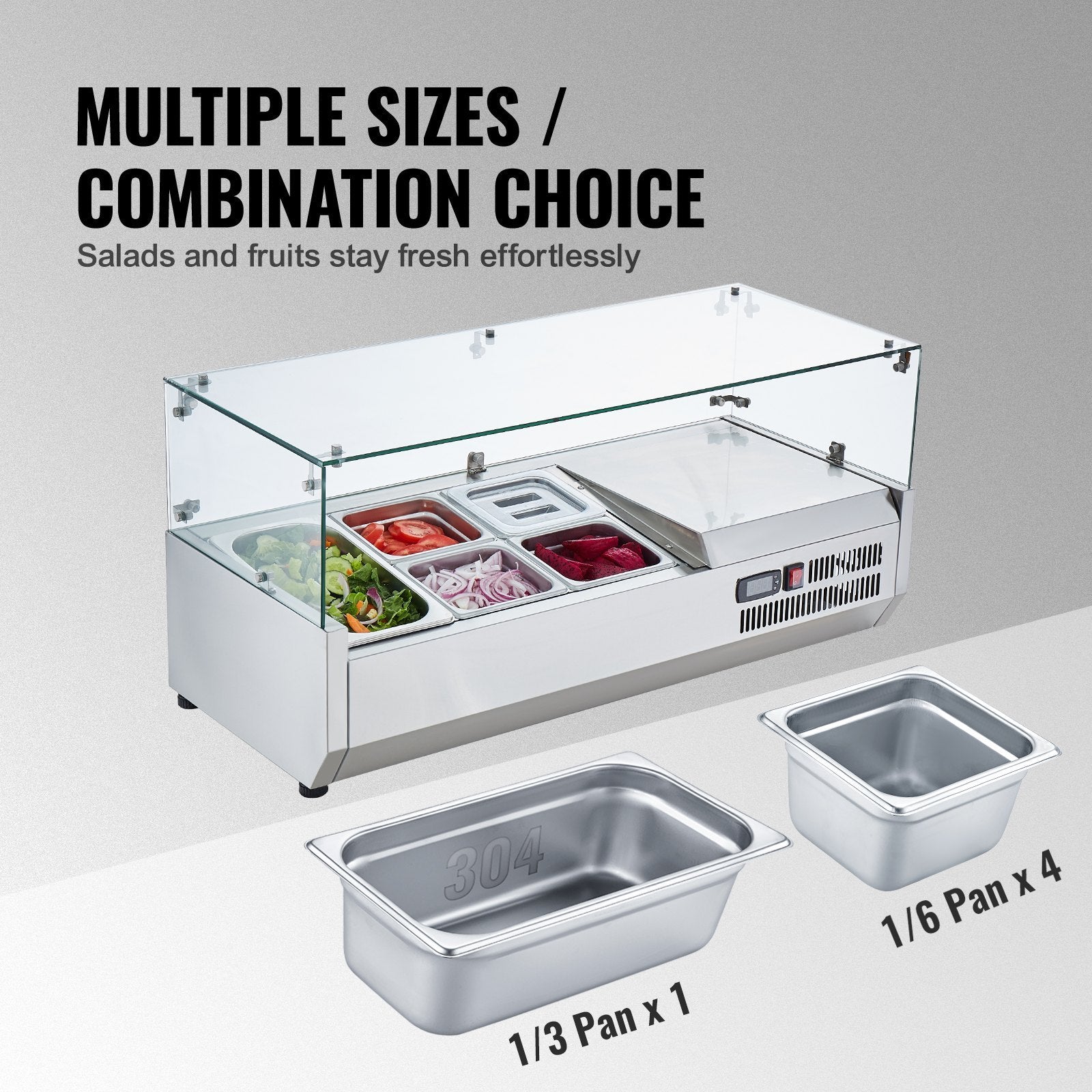 VEVOR Refrigerated Condiment Prep Station, 130 W Countertop Refrigerated Condiment Station,304 Stainless Body And PC Lid, Sandwich Prep Table With Glass Guard, ETL