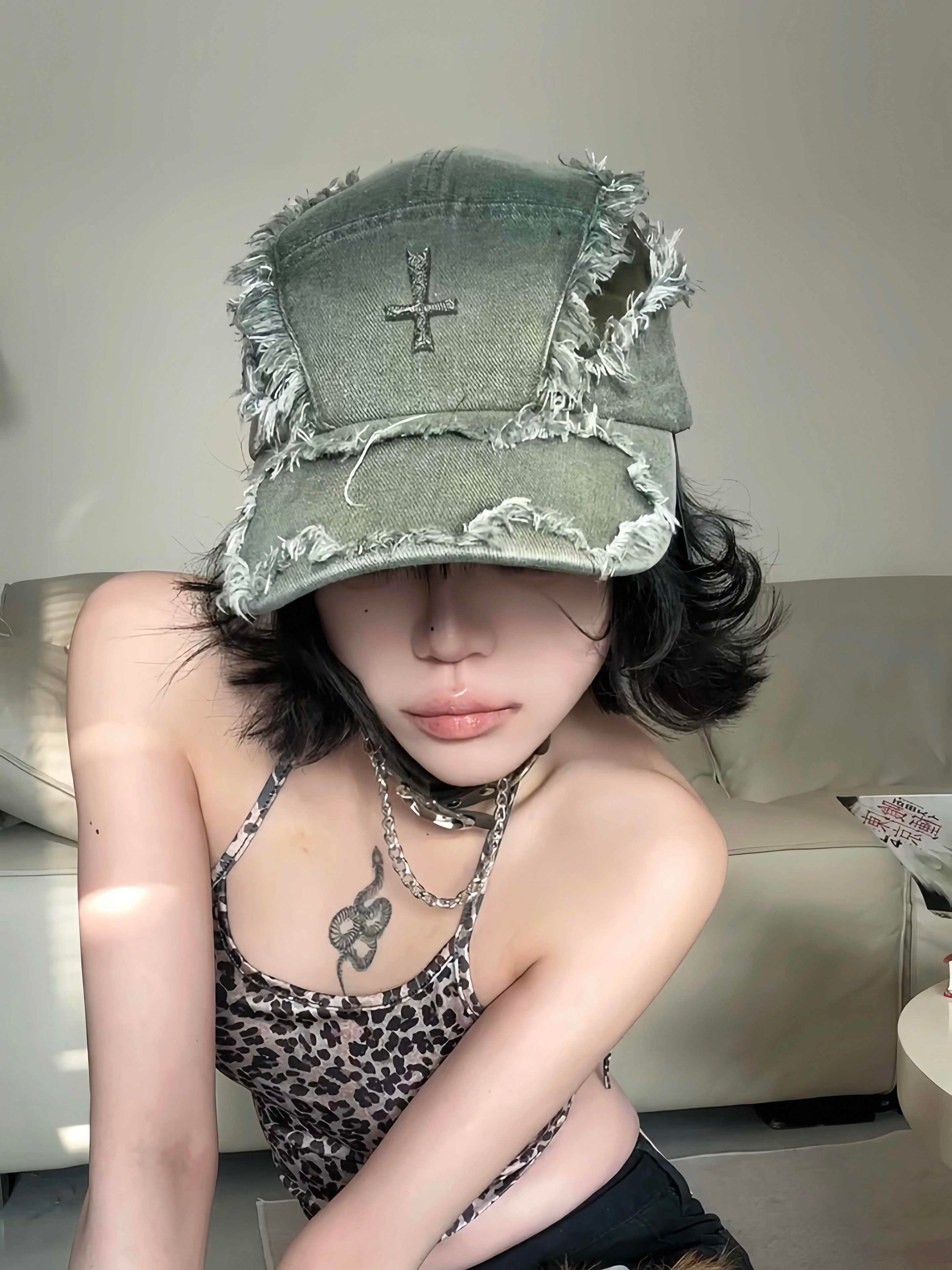 Washed Destroyed Leather Patchwork Denim Cross Baseball Cap