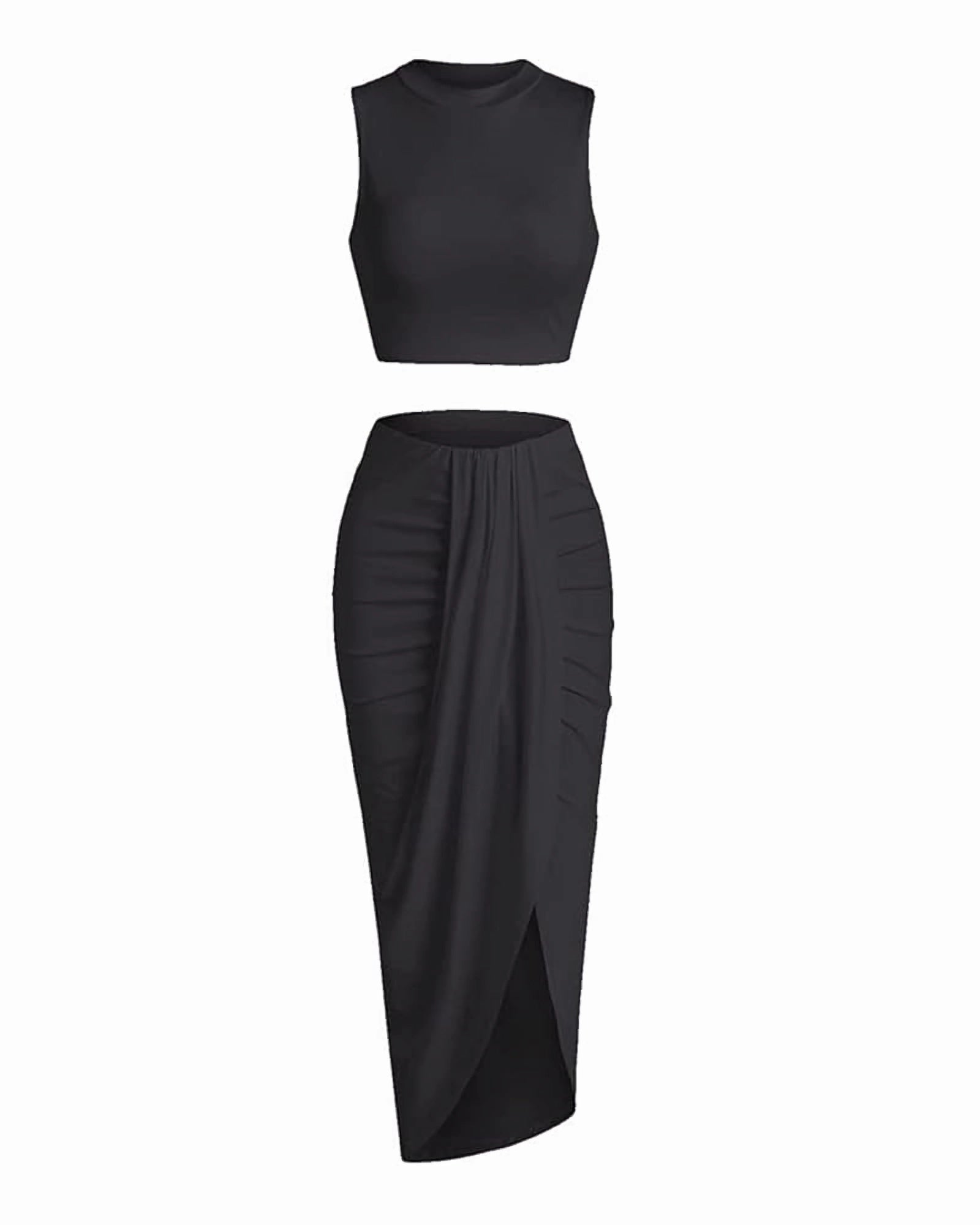 Women's Casual Sleeveless Summer Two Piece Outfits Crop Top And Side Split Draped Ruched Maxi Skirt Set Solid Suiting
